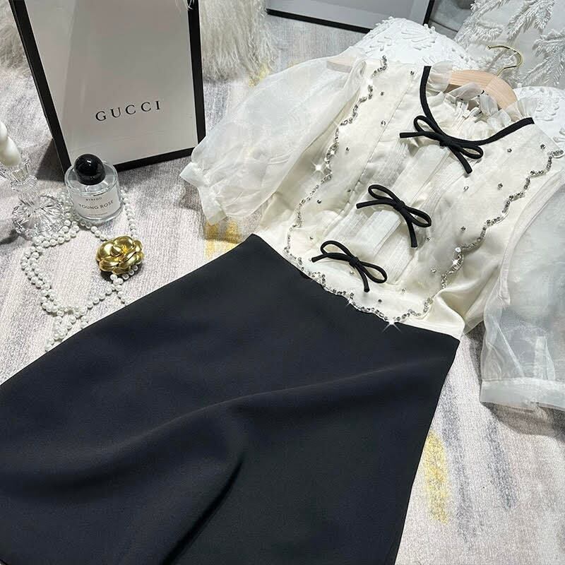 煌めくラインストーンと可愛らしいリボンがアクセントのワンピース。半袖のパフスリーブが女性らしさを引き立て、ショート丈で足元をスリムに見せてくれます。バイカラーデザインが上品さを演出し、ハイウエストでスタイルアップも叶います。シンプルでありながらも存在感があり、大人女子のおしゃれ心をくすぐる一着です。