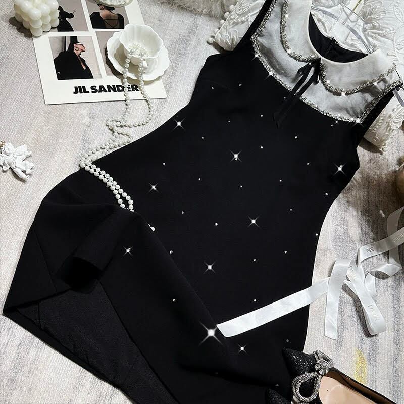 レディース ワンピース ノースリーブ ショート丈 襟付き ラウンドネック リボン ラインストーン Aライン ハイウエスト スリム 細身 きれいめ 上品 おしゃれ お洒落 大人可愛い 大人女子 シンプル カジュアル キュート ラブリー ガーリー シック フェミニン レトロ 主役級 存在感 こなれ感 抜け感 夏 10代 20代 お出かけ デート 女子会 ショッピング レストラン 旅行 お泊まり 休日 普段使い 韓国 韓国系 オルチャン ファッション コーデ スタイル インスタ映え 脚長 S M L ブラック