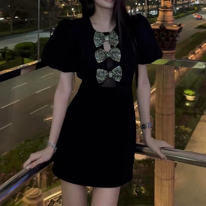 エレガントで上品な雰囲気漂う半袖ワンピース。パフスリーブデザインが女性らしい華やかさを演出。ショート丈なので、足首までスッキリ見せてくれます。また、リボンデザインがとってもっキュート。スリムで細身のデザインで、着るだけでスタイルアップ効果抜群です。