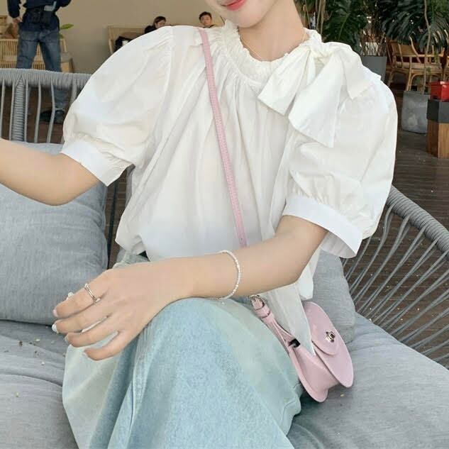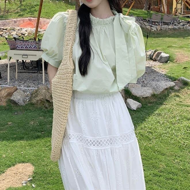 レディース トップス シャツ 半袖 パフスリーブ ラウンドネック 薄手 リボン 無地 プルオーバー ルーズ きれいめ 上品 おしゃれ お洒落 大人可愛い 大人女子 シンプル カジュアル かっこいい エレガント キュート ラブリー ガーリー フェミニン レトロ 主役級 存在感 こなれ感 抜け感 夏 10代 20代 30代 お出かけ デート 女子会 ショッピング レストラン 旅行 お泊まり 休日 普段使い デイリー 韓国 オルチャン ファッション コーデ スタイル インスタ映え ワンサイズ グリーン ホワイト