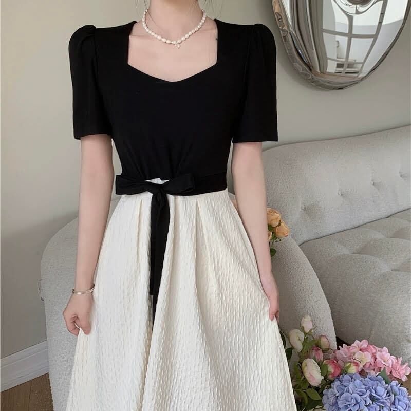 レディース ワンピース 半袖 スクエアネック ウエストリボン Aライン コントラストカラー ロング丈 ハイウエスト スリム 細身 きれいめ 上品 おしゃれ お洒落 大人可愛い 大人女子 シンプル カジュアル エレガント クール モダン シック フェミニン レトロ 主役級 存在感 こなれ感 抜け感 夏 20代 30代 40代 お出かけ デート 女子会 ショッピング お泊まり 普段使い 韓国 オルチャン ファッション コーデ スタイル インスタ映え 脚長 L XL 2XL 3XL 4XL ホワイト ブラック