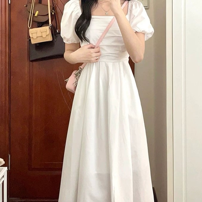 レディース スカート ワンピース フレアスカート ロングスカート ミモレ ロング 半袖 パフスリーブ スクエアネック フレア スリム 細身 Aライン 切り替え ドレープ フェミニン タックプリーツ ハイウエスト かわいい 大人可愛い シンプル カジュアル おしゃれ ガーリー ヴィンテージ プリンセス クラシカル ロマンティック ドーリー 春 夏 デート お出かけ レストラン 公園 女子会 休日 ショッピング 韓国 オルチャン コーデ 体型カバー 脚長 普段使い モテ サイズ S M L XL 白 ホワイト
