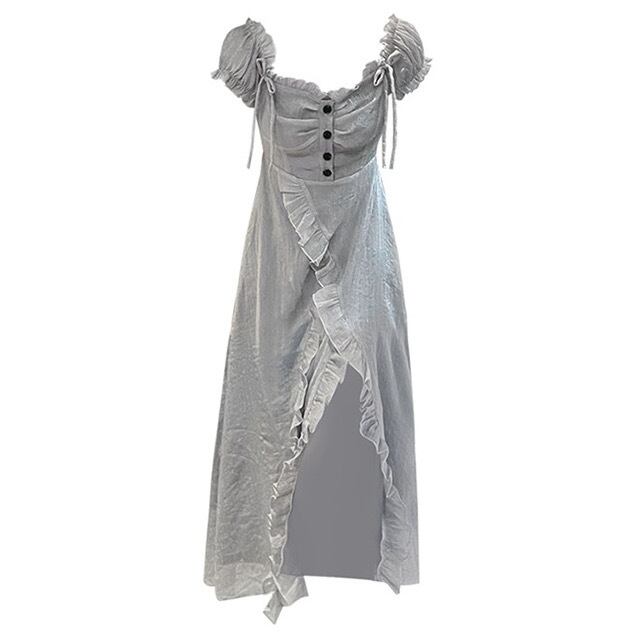 レディース スカート ワンピース ロングスカート 膝下 ミモレ ロング 半袖 パフスリーブ フリル袖 Vネック スクエアネック セミフレア スリム 細身 Aライン アシンメトリー 切り替え ドレープ フェミニン タック タックプリーツ フリル スリット ハイウエスト 大人可愛い おしゃれ かっこいい ガーリー エレガント 主役 存在感 ロマンティック セクシー シック 無地 春 夏 デート お出かけ レストラン 公園 女子会 休日 ショッピング 韓国 コーデ 普段使い サイズ S M L グレー シルバー