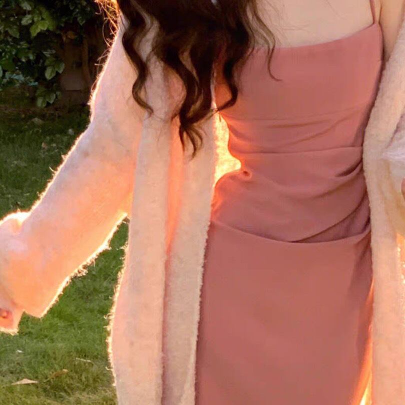 落ち着いたピンクの色味が女性らしさを引き立てる、大人可愛いキャミワンピースドレス。