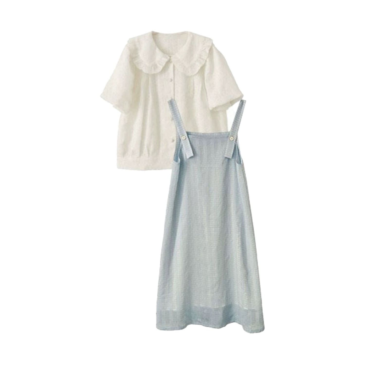 レディース トップス ワンピース シャツ ブラウス セットアップ ジャンパースカート ロングスカート ミモレ ロング 半袖 パフスリーブ ラウンドネック 襟付き 丸襟 セミフレア スリム Aライン セパレート フェミニン フリル 薄手 かわいい 大人可愛い シンプル カジュアル おしゃれ レトロ ガーリー クラシカル 少女感 無地 春 夏 デート お出かけ 公園 女子会 休日 ガーデン ショッピング 重ね着 韓国 コーデ 普段使い 着回し レイヤード 清楚 S M L XL 白 ホワイト 水色 ブルー