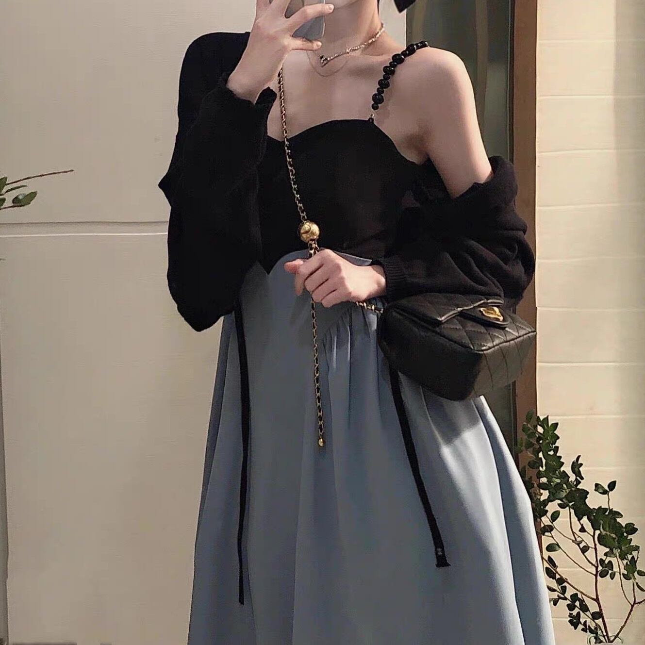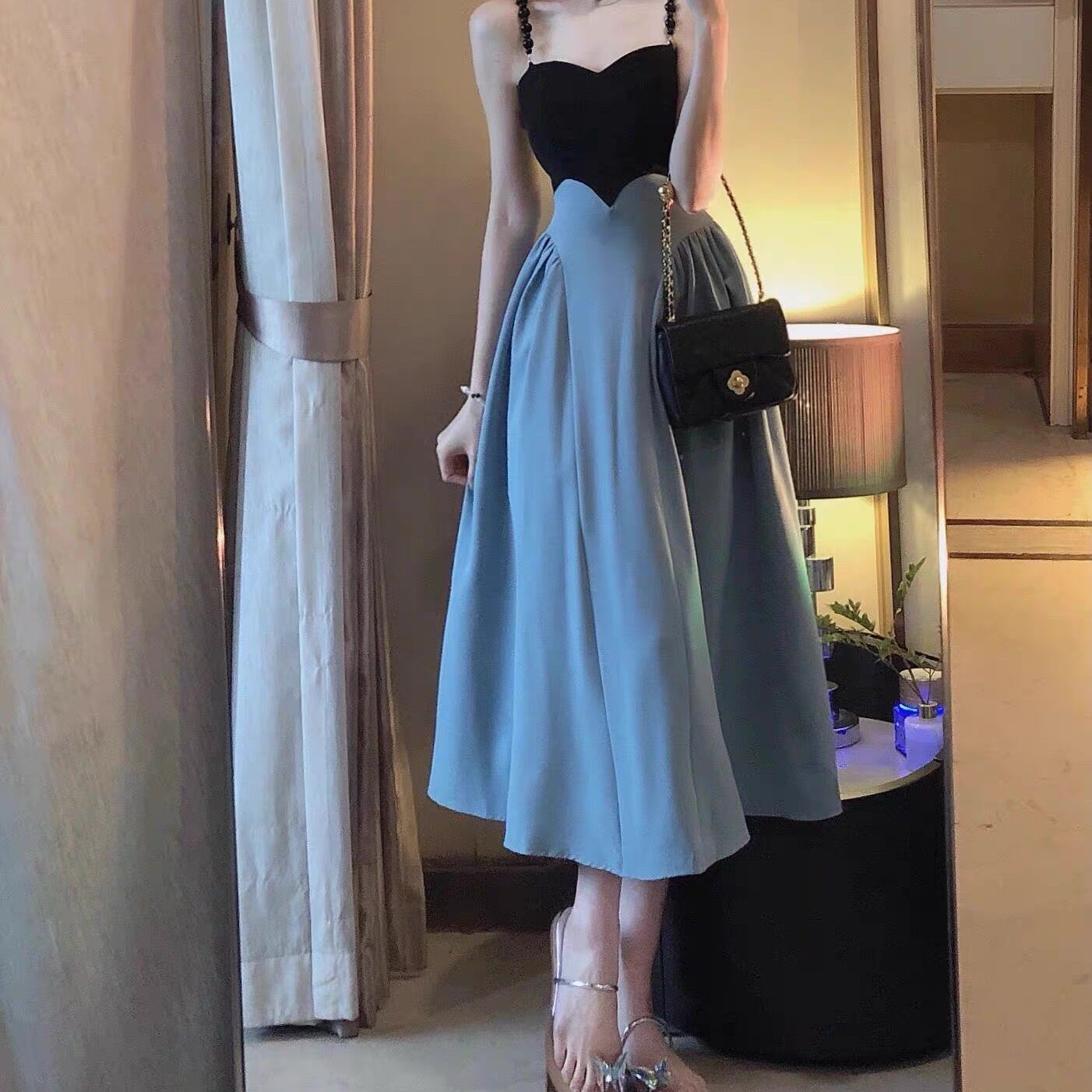 ブラックとブルーの配色が上品でクラシカルな雰囲気を漂わせる、キャミワンピースドレス。