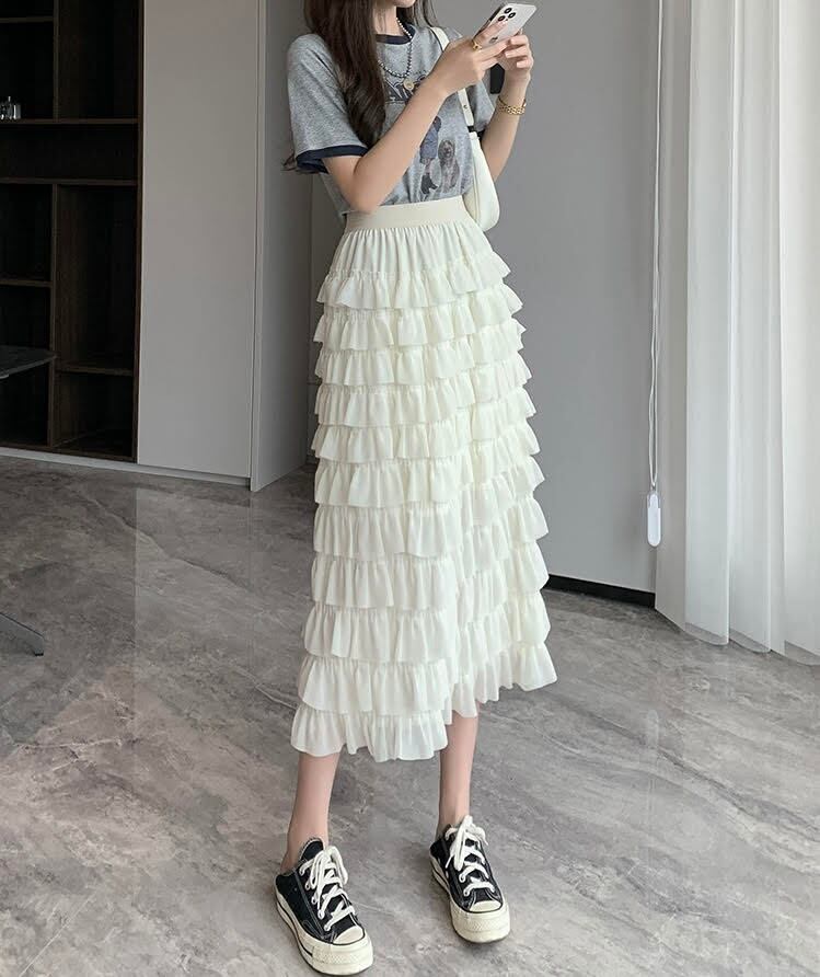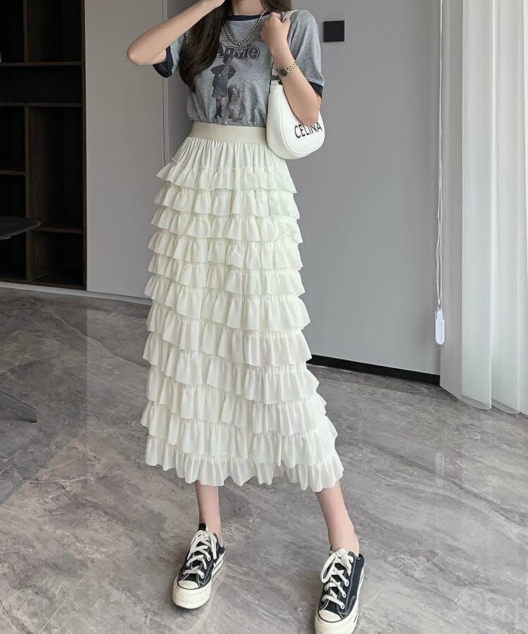 レディース スカート ミモレ丈 フリル ケーキスカート シフォン ウエストゴム 伸縮性 Aライン ハイウエスト スリム 細身 きれいめ 上品 おしゃれ お洒落 大人可愛い 大人女子 シンプル カジュアル エレガント クール モダン シック フェミニン レトロ 主役級 存在感 こなれ感 抜け感 夏 20代 30代 40代 お出かけ デート 女子会 ショッピング お泊まり 休日 普段使い 韓国系 デイリー オルチャン ファッション コーデ スタイル インスタ映え 脚長 S M L XL ホワイト ブラック