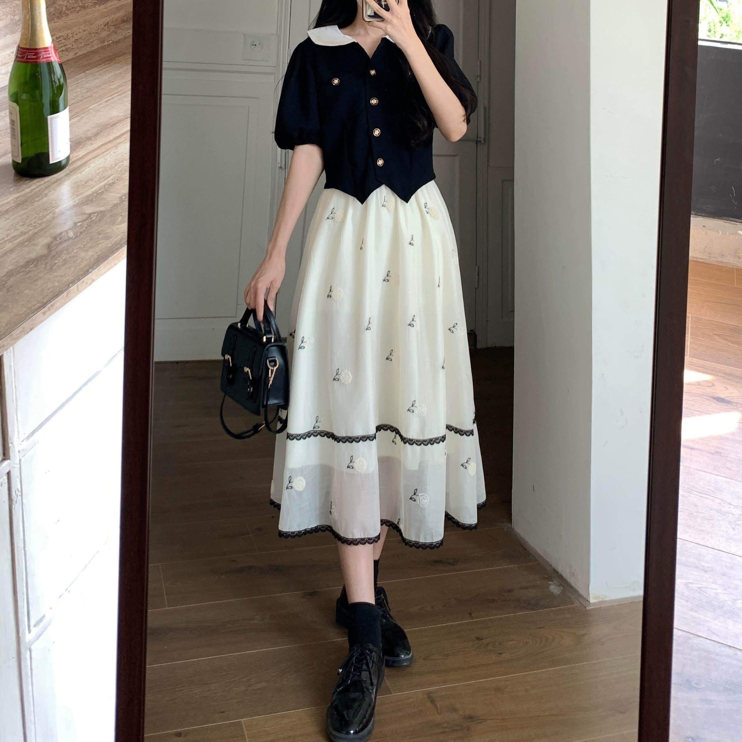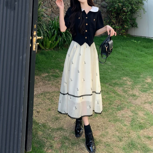 半袖カットソーとミモレ丈スカートのセットアップ。上品な半袖カットソーには襟付きポロカラーがアクセント。スカートはミモレ丈で女性らしさを引き立てる上、透け感のあるレース素材で大人可愛い雰囲気に。夏のお出かけやデート、女子会にぴったり。レトロな雰囲気も漂わせながら、シンプルでエレガントなスタイリングが魅力です。