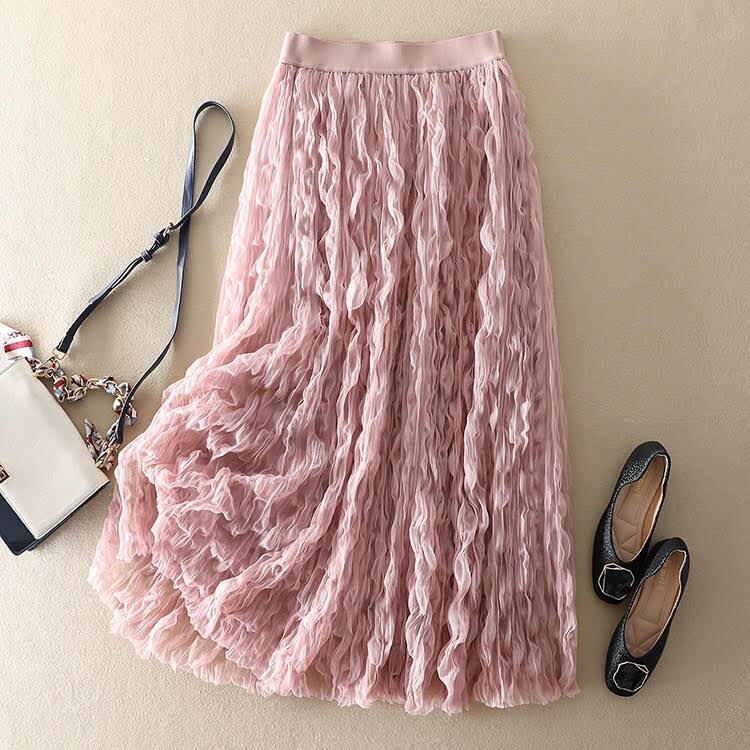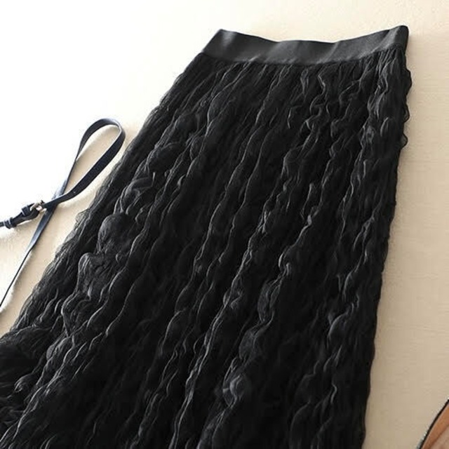 トレンド感満載のロング丈プリーツスカート。上品なドレープとウエストゴム仕様で着心地も抜群。Aラインのシルエットで、ハイウエストスタイルが脚長効果を演出します。シンプルなデザインながらも、大人可愛い雰囲気が漂う一枚です。