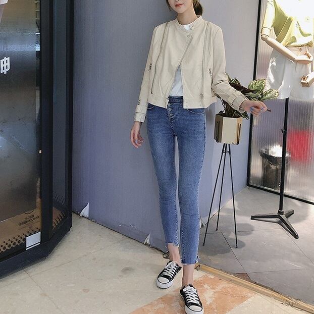 大人可愛いベージュのライダースジャケット。Vネックの襟や前開きのファスナーが女性らしさを引き立て、ショート丈でスタイルアップ効果も抜群です。シンプルでカジュアルな着こなしに一押しの一着です。
