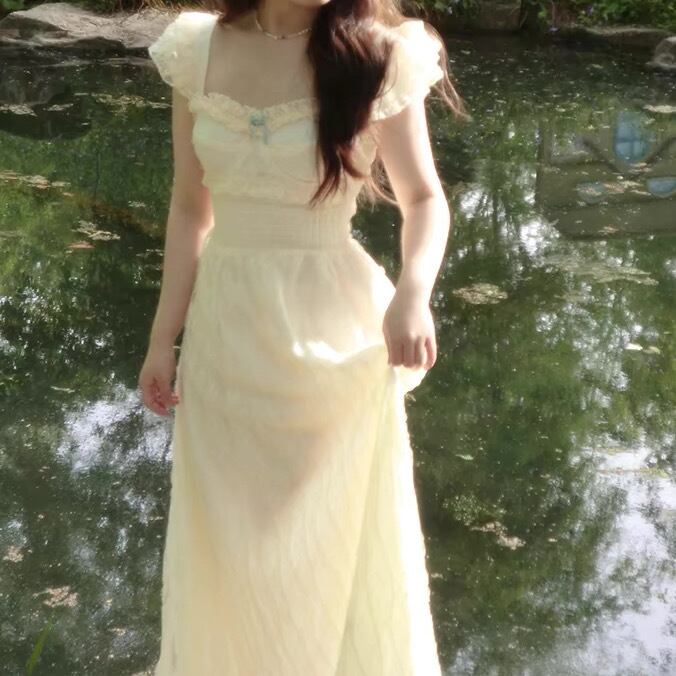 レディース スカート ワンピース ドレス フレアスカート ロングスカート レーススカート ロング ノースリーブ フレアスリーブ スクエアネック フレア スリム Aライン 切り替え フェミニン タックプリーツ 刺繍 シフォン フリル リボン ウエストマーク ハイウエスト 透け感 ギャザー 落ち感 かわいい 大人可愛い カジュアル おしゃれ ガーリー 個性的 ラブリー プリンセス ロマンティック フェアリー 春 夏 デート お出かけ イベント ショッピング 韓国 コーデ サイズ S M L XL アプリコット