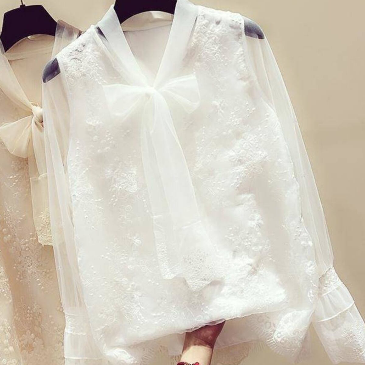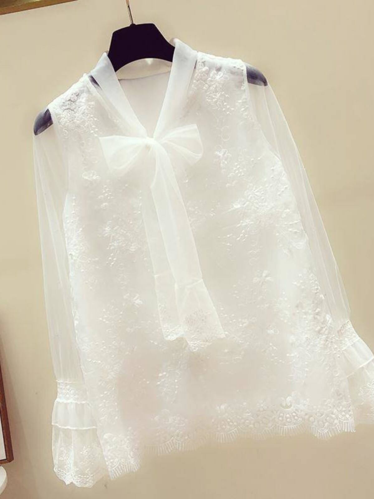 トップス シャツ 長袖 レディース Vネック フェミニン レース シフォン リボン 透け感 シースルー かわいい 大人可愛い きれいめ シンプル 上品 おしゃれ こなれ感 ガーリー エレガント 主役級 存在感 ラブリー キュート ロリータ プリンセス 都会的 クラシカル ロマンティック ナチュラル 花柄 フラワー 春 夏 秋 ロングシーズン デート お出かけ イベント リゾート 旅行 女子会 休日 バカンス ガーデン ショッピング カフェ 体型カバー 普段使い S M L 白 ホワイト オフホワイト