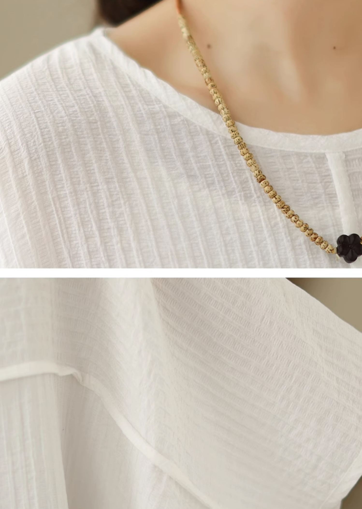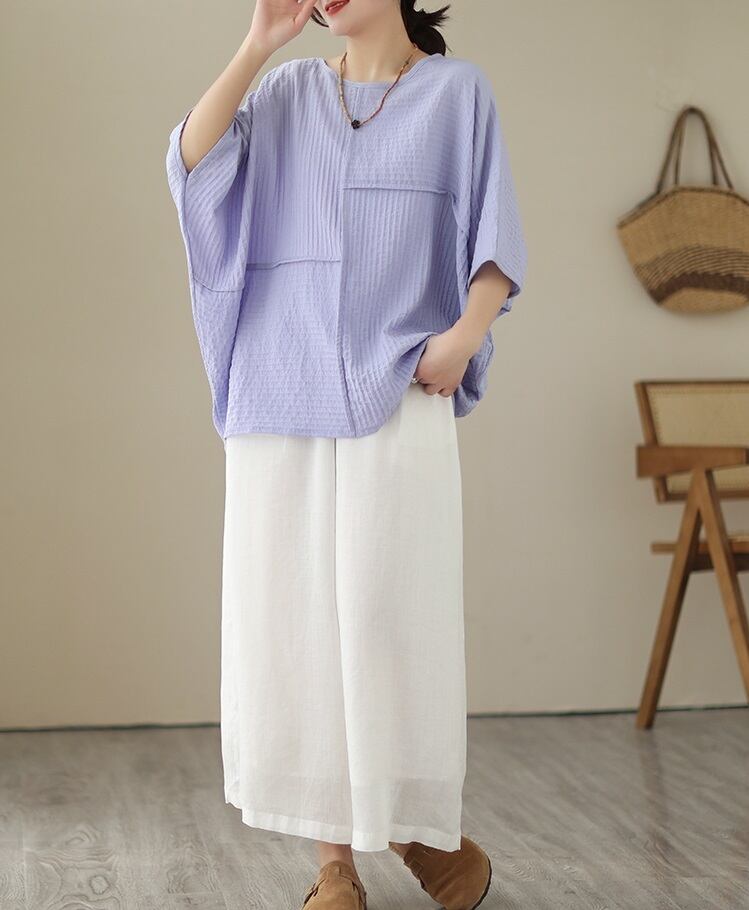 麻素材と綿の快適な着心地が魅力の、綿 リネン 七分袖 Tシャツ。ドルマンスリーブとアシンメトリーなブロックプリーツデザインがおしゃれな印象を与え、シンプルながらも大人かわいい雰囲気を演出します。襟なしで着やすく、体型をカバーしつつもスタイリッシュに見せてくれるアイテムです。カジュアルな日常使いから通勤やデートまで、様々なシーンで活躍してくれること間違いありません。ライトパープルやブラック、ホワイトなど豊富なカラーバリエーションも魅力的。着回し力も抜群で、一枚あると重宝すること間違いなしです。