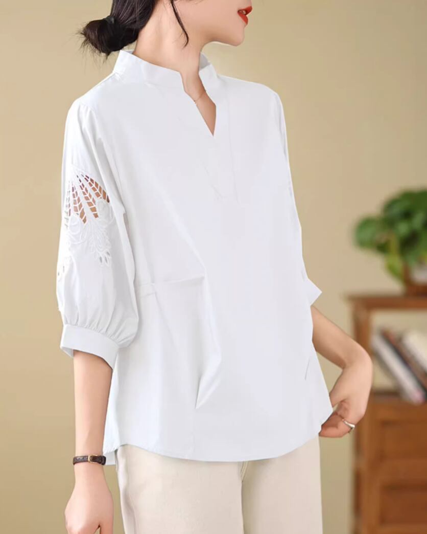 花柄 透かし編みレース 七分袖 シャツ ブラウス レディース トップス プルオーバー 丈長 半袖 7分袖 パフスリーブ Vネック スタンドカラー スキッパー レース 刺繍 透け感 綿 かわいい 大人可愛い カジュアル 上品 おしゃれ ルーズ 個性的 エレガント 存在感 フラワー 春 夏 ママ 通勤 デート お出かけ 旅行 公園 女子会 休日 ショッピング カフェ 体型カバー 普段使い 着回し M L XL 2XL 大きいサイズ ゆったり 白 ホワイト 黄色 イエロー 水色 ネイビー ライトブルー
