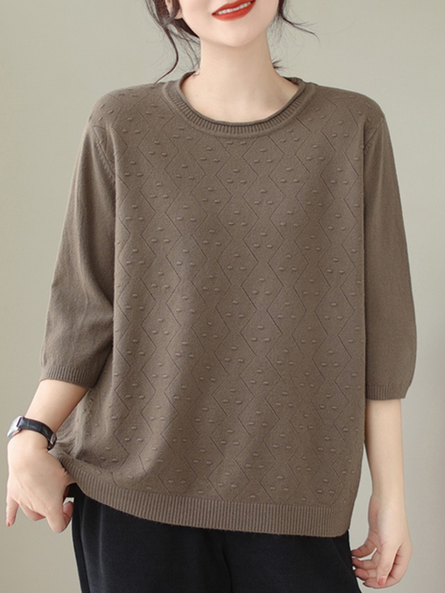 七分袖 ラウンドネック ニットセーター レディース トップス ニット セーター プルオーバー 丈長 半袖 7分袖 襟なし リブ かわいい 大人可愛い きれいめ シンプル カジュアル おしゃれ こなれ感 ルーズ 柄 春 夏 秋 ママ 通勤 デート お出かけ 旅行 公園 女子会 休日 ショッピング カフェ 重ね着 楽ちん 体型カバー 普段使い 着回し レイヤード ゆったり ゆる フリーサイズ 黒 ブラック 紫 茶色 ブラウン アプリコット パープル