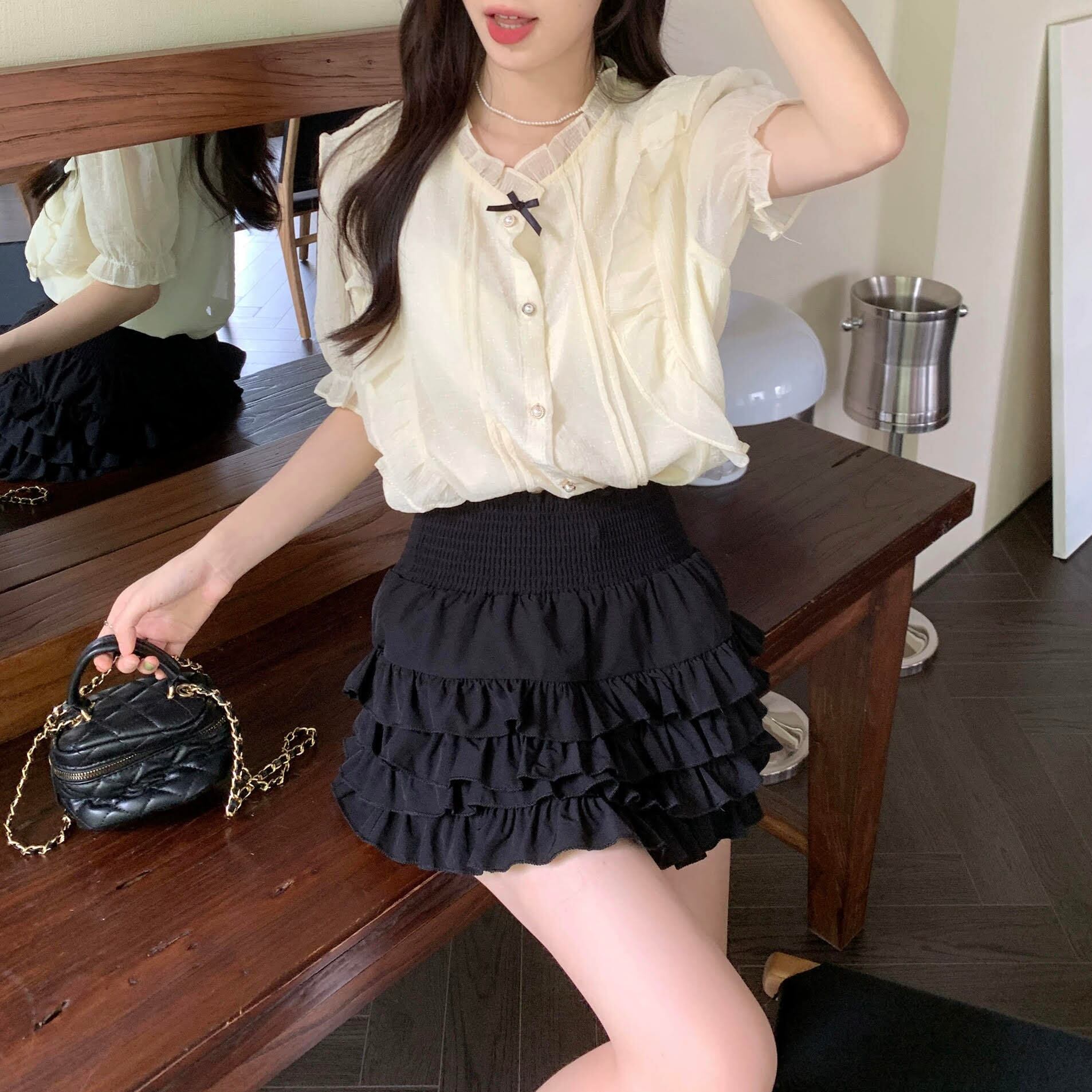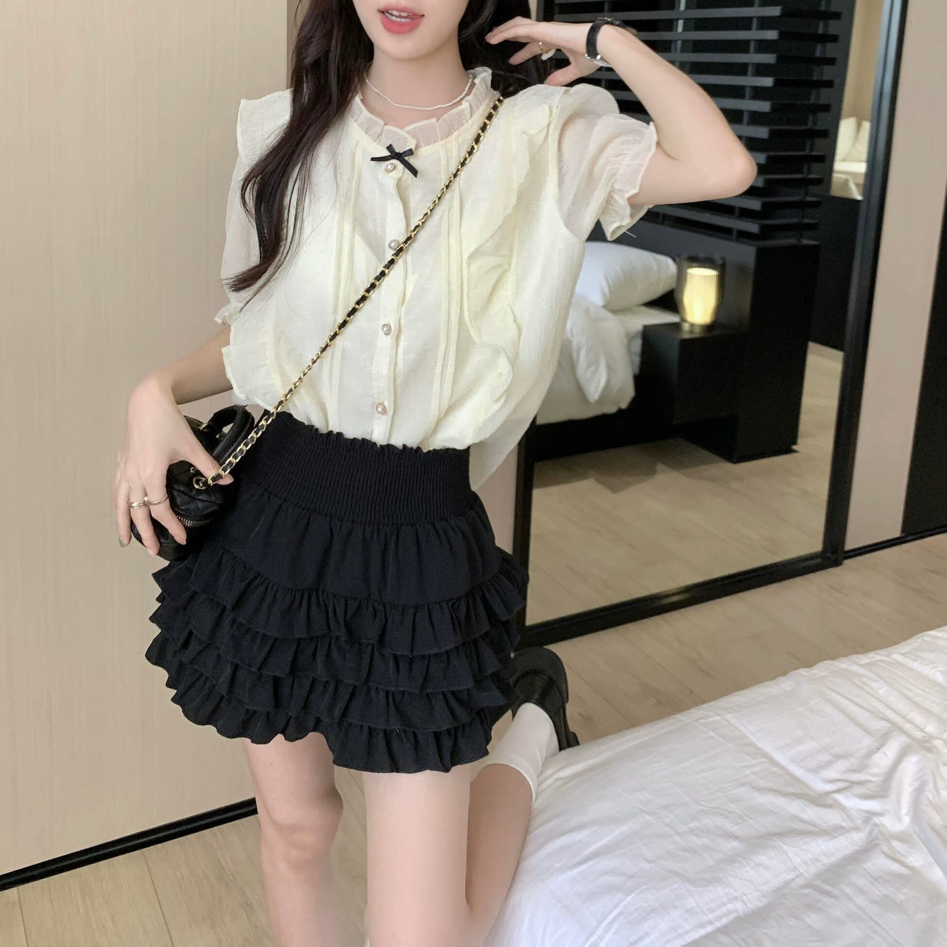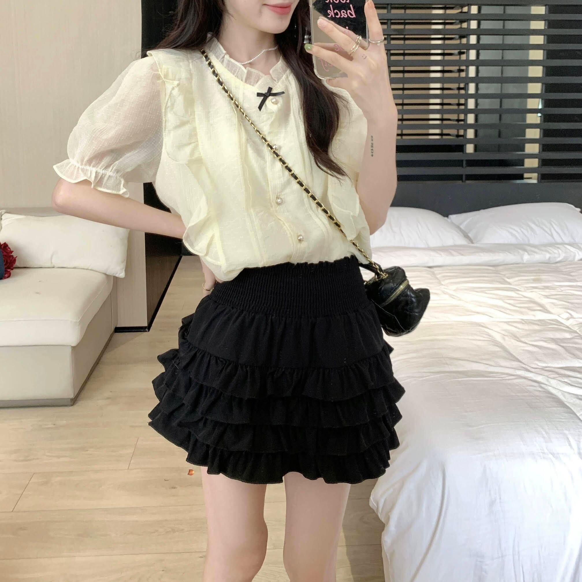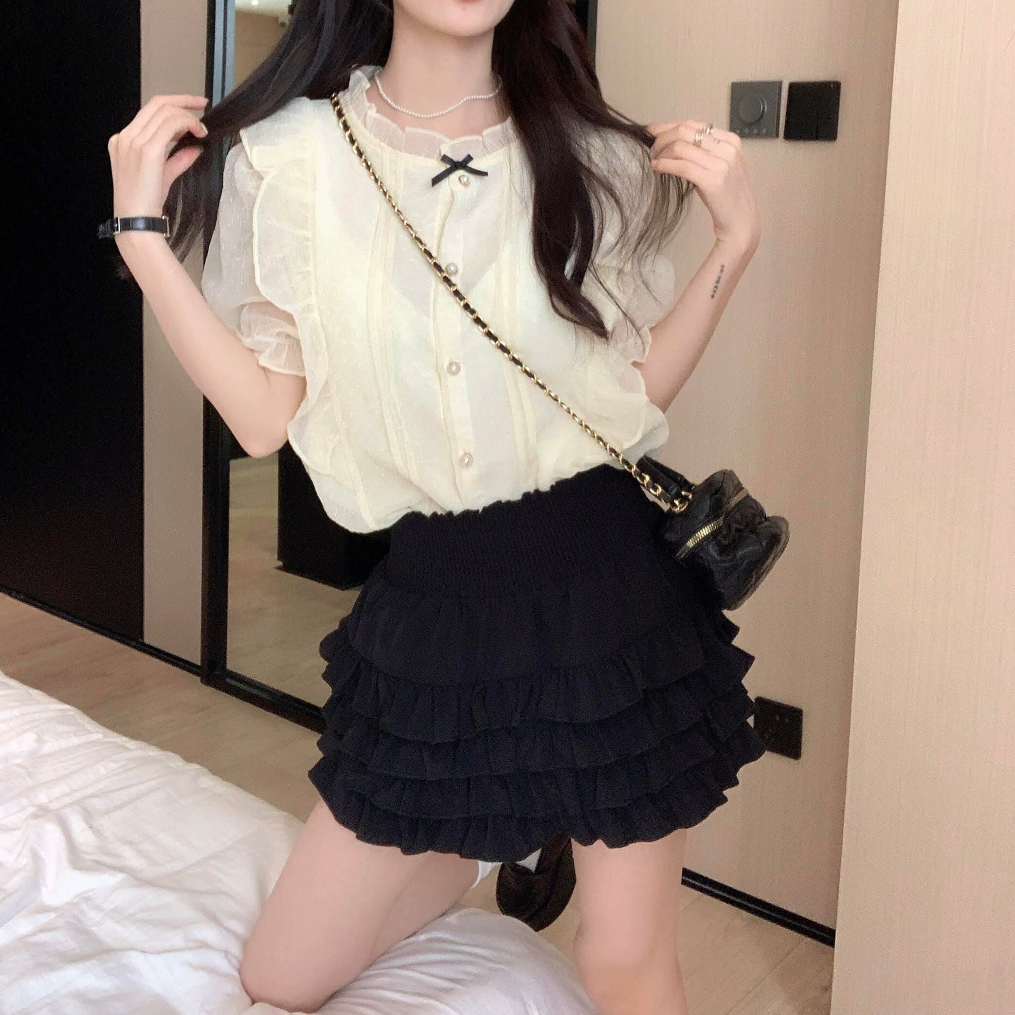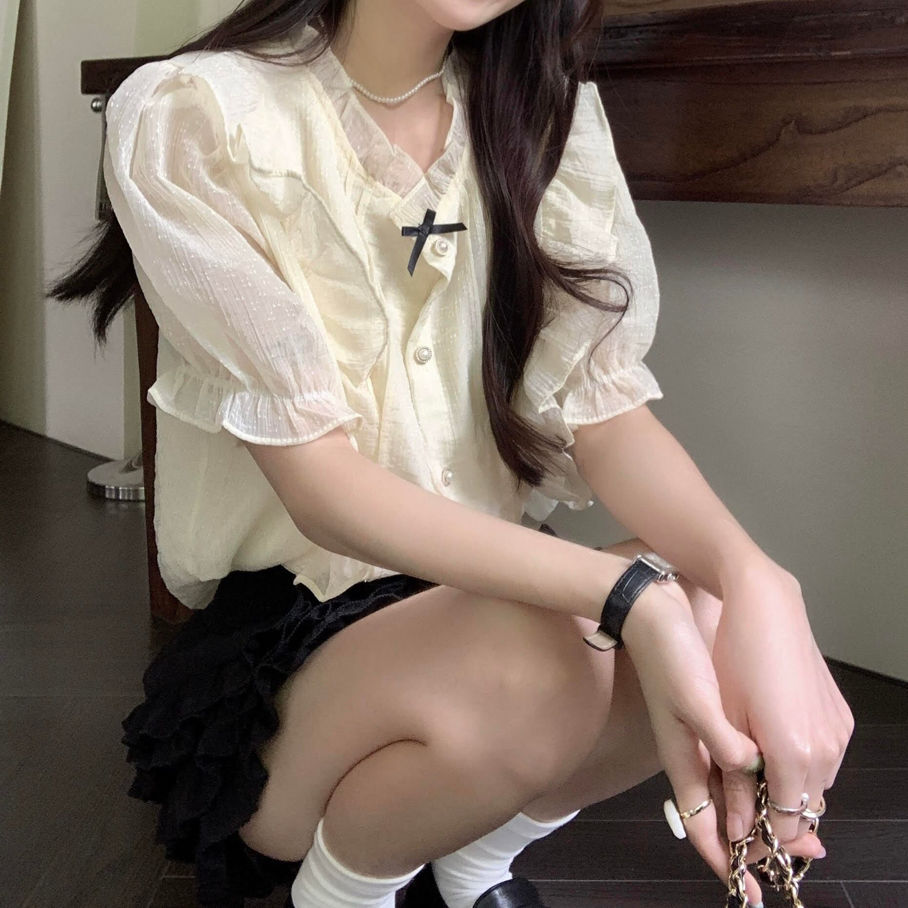 レディース トップス カットソー 半袖 パフスリーブ ラウンドネック リボン フリル 透け感 シースルー ボタン 前開き スリム 細身 きれいめ 上品 おしゃれ お洒落 大人可愛い 大人女子 シンプル カジュアル エレガント キュート ラブリー ガーリー フェミニン レトロ 主役級 存在感 こなれ感 抜け感 夏 10代 20代 お出かけ デート 女子会 ショッピング レストラン 旅行 休日 普段使い 韓国系 オルチャン ファッション コーデ スタイル 美スタイル インスタ映え ワンサイズ アプリコット
