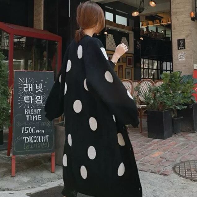 トレンド感のある大きめなドット柄が目を引くウールロングコーディガン。