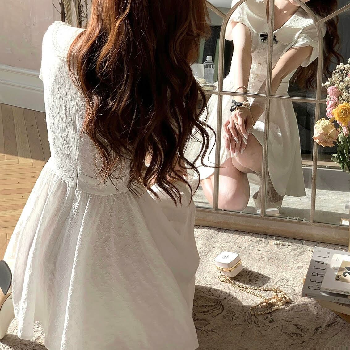 レディース ワンピース 半袖 パフスリーブ 襟付き ドールカラー リボン Aライン ボタン ジッパー ショート丈 ハイウエスト スリム 細身 きれいめ 上品 おしゃれ お洒落 大人可愛い 大人女子 シンプル カジュアル エレガント キュート ラブリー ガーリー フェミニン レトロ 主役級 存在感 こなれ感 抜け感 夏 10代 20代 お出かけ デート 女子会 ショッピング お泊まり 普段使い 韓国系 オルチャン ファッション コーデ スタイルアップ インスタ映え 脚長 美脚 XS S M L ホワイト