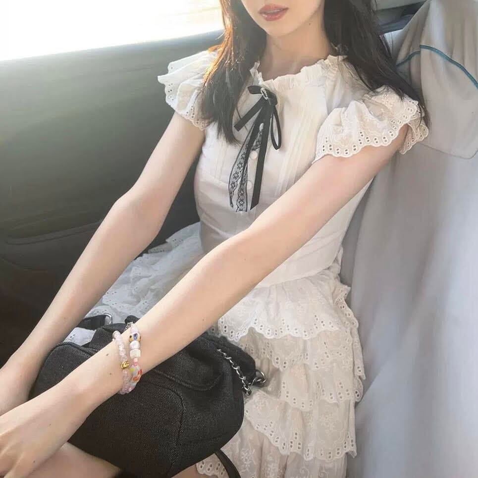 レディース ワンピース 半袖 フライングスリーブ クルーネック リボン フリル レース ケーキスカート ショート丈 ハイウエスト スリム 細身 きれいめ 上品 おしゃれ お洒落 大人可愛い 大人女子 シンプル カジュアル エレガント キュート ラブリー ガーリー フェミニン レトロ 主役級 存在感 こなれ感 抜け感 夏 10代 20代 お出かけ デート 女子会 ショッピング お泊まり 普段使い 韓国 韓国系 オルチャン ファッション コーデ スタイルアップ インスタ映え 脚長 美脚 S M L ホワイト