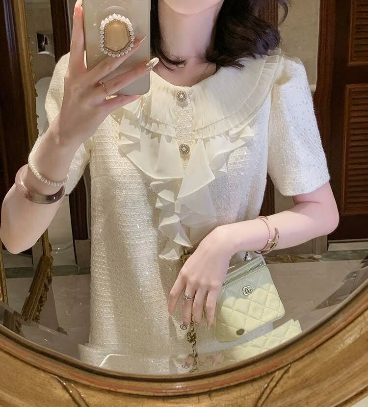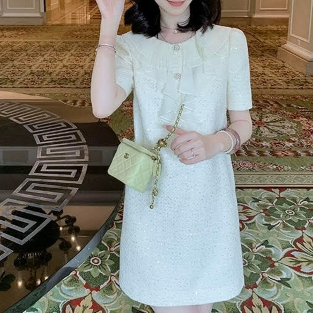 フェミニンで可愛らしい雰囲気漂う半袖ワンピース。華やかなフリルや上品なAラインシルエットが、女性らしさを引き立てます。ショート丈デザインで足元をスッキリ見せスリムな印象を演出します。カジュアルからエレガントまで、様々なシーンに対応する万能アイテムです。