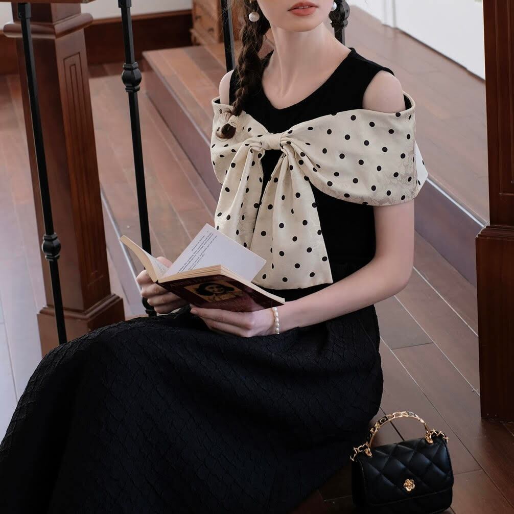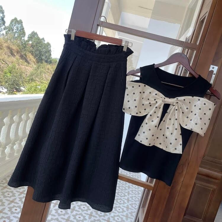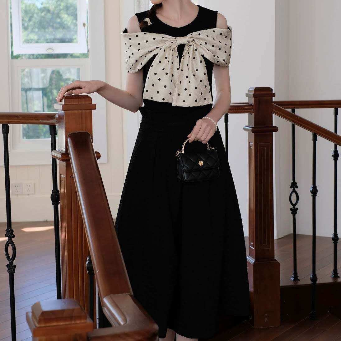 レディース セットアップ カットソー 半袖 ラウンドネック リボン ドット柄 プルオーバー スカート ロング丈 Aライン ハイウエスト 2点セット 上下セット スリム 細身 きれいめ 上品 おしゃれ お洒落 大人可愛い 大人女子 個性的 カジュアル かっこいい エレガント キュート ラブリー ガーリー レトロ 主役級 存在感 こなれ感 抜け感 夏 20代 30代 お出かけ デート 女子会 お泊まり 休日 普段使い 韓国系 オルチャン ファッション コーデ スタイル インスタ映え 脚長 S M L ブラック
