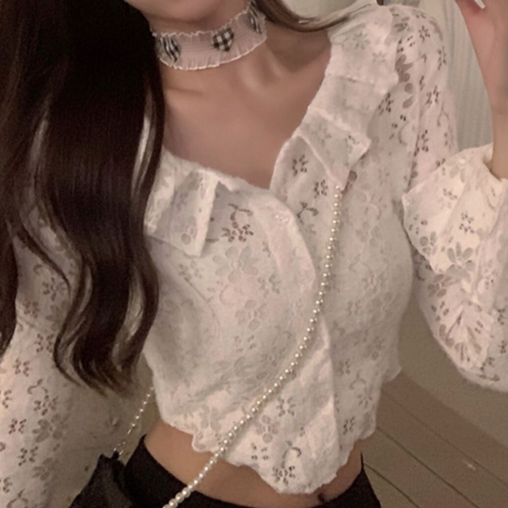 レディース トップス シャツ ショート 長袖 襟付き スリム レース 透け感 ボタン 大人可愛い きれいめ おしゃれ かっこいい ラフ ガーリー クール 都会的 ナチュラル 花柄 秋 冬 通勤 デート お出かけ お泊まり イベント 旅行 レストラン 公園 女子会 休日 ホテル ショッピング コンサート ライブ カフェ 韓国 コーデ 楽ちん プレゼント 普段使い 着回し モテ インスタ映え フリーサイズ ホワイト