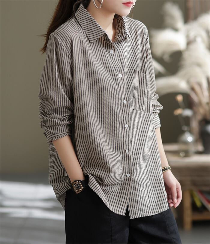ストライプ柄 長袖 ルーズ シャツ レディース トップス 丈長 襟付き 角襟 ポロカラー ポケット 前開き ヴィンテージ かわいい 大人可愛い シンプル カジュアル おしゃれ レトロ こなれ感 マニッシュ ルーズ 個性的 ストライプ 春 夏 秋 冬 ママ 通勤 学生 学校 通学 デート お出かけ 旅行 公園 女子会 休日 ショッピング カフェ 重ね着 体型カバー 普段使い 着回し レイヤード 紫外線対策 UV対策 M L XL 2XL 大きいサイズ ゆったり ストライプ柄