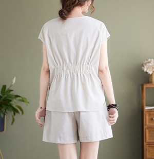 春夏のお出かけにぴったりなセットアップが新登場!上下のセットでお得感満載です。麻混素材のトップスは、フレンチスリーブとギャザーデザインで上品な印象を与えます。ショートパンツはハイウエストのリネン素材で、軽やかな着心地が魅力的。どちらもシンプルで使いやすいデザインなので、コーディネートも楽々です。