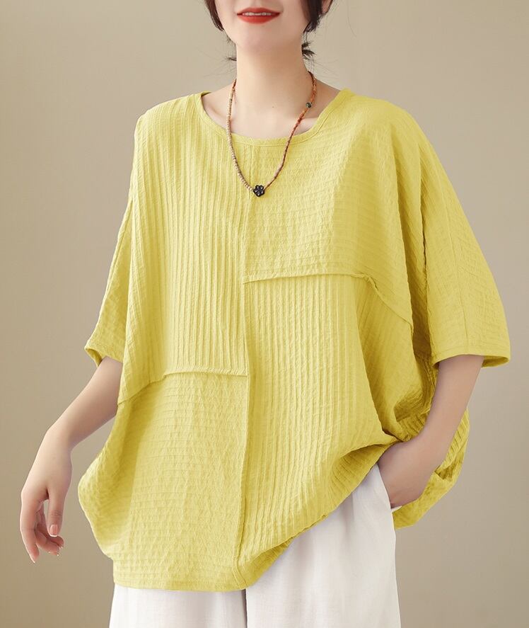 綿 麻 ブロック ストライプ柄 エンボス シャツ ブラウス レディース トップス プルオーバー 丈長 半袖 7分袖 ドルマンスリーブ ラウンドネック 襟なし 透け感 シースルー リネン かわいい 大人可愛い シンプル カジュアル おしゃれ ルーズ ボーダー ストライプ 春 夏 ママ 通勤 デート お出かけ 旅行 公園 女子会 休日 ショッピング カフェ 体型カバー 普段使い 着回し L XL 2XL 3XL 4XL 5XL 大きいサイズ ゆったり 白 ホワイト 黒 ブラック 黄色 イエロー ライトパープル