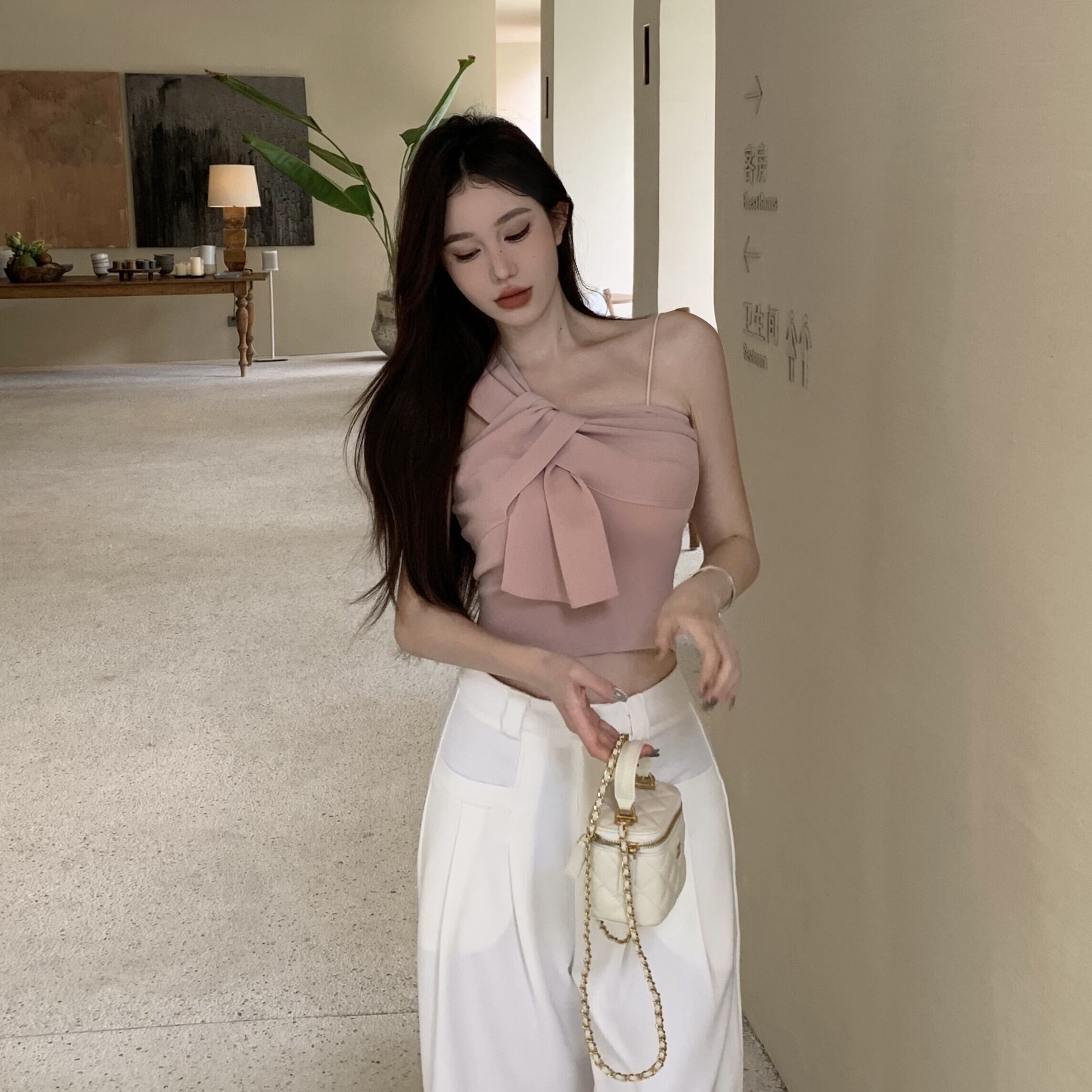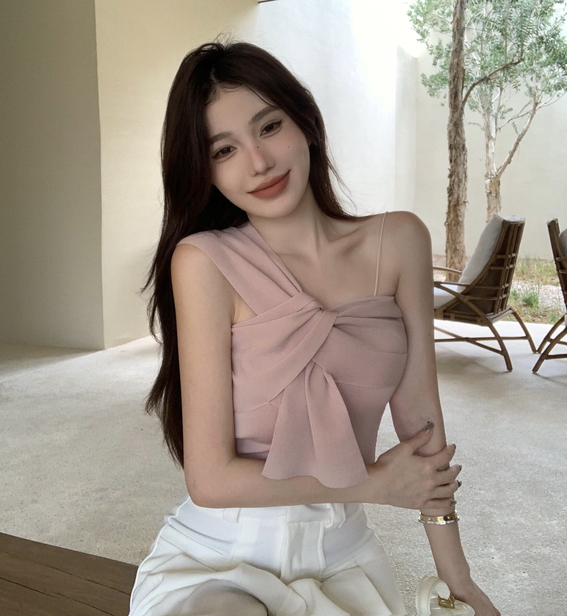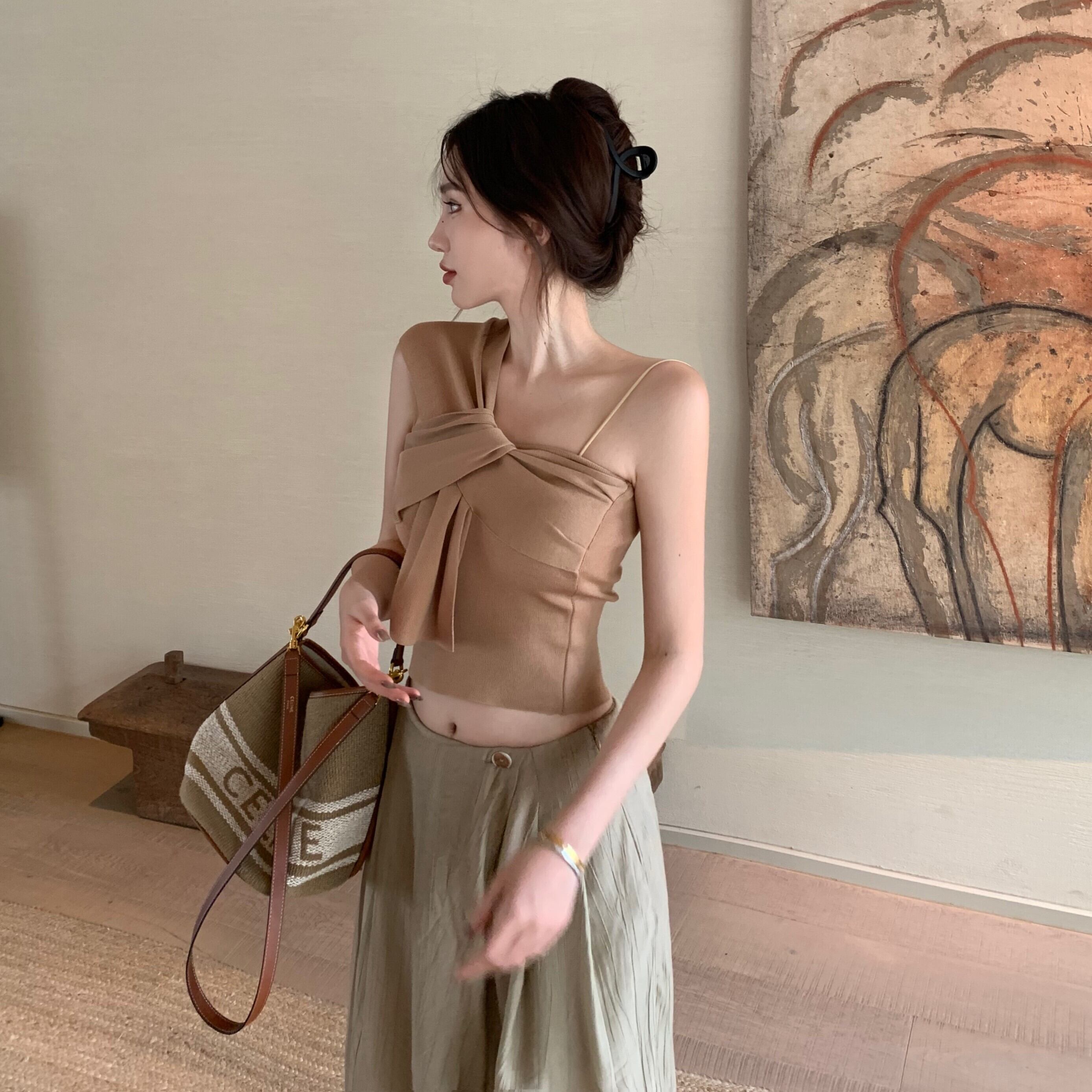 アシンメトリーなショルダーデザインが目を引くクロップドキャミソールです。リボン風のツイストデザインがポイントで、鎖骨や肩のラインを美しく演出し、女っぽさを引き立てます。伸縮性がある生地で着心地がよく、スリムシルエットのおへそが見える短め丈ですっきり脚長効果も抜群!夏のデートやお出かけ、リゾートやビーチなど、肌見せを楽しみたい日にぴったりです。