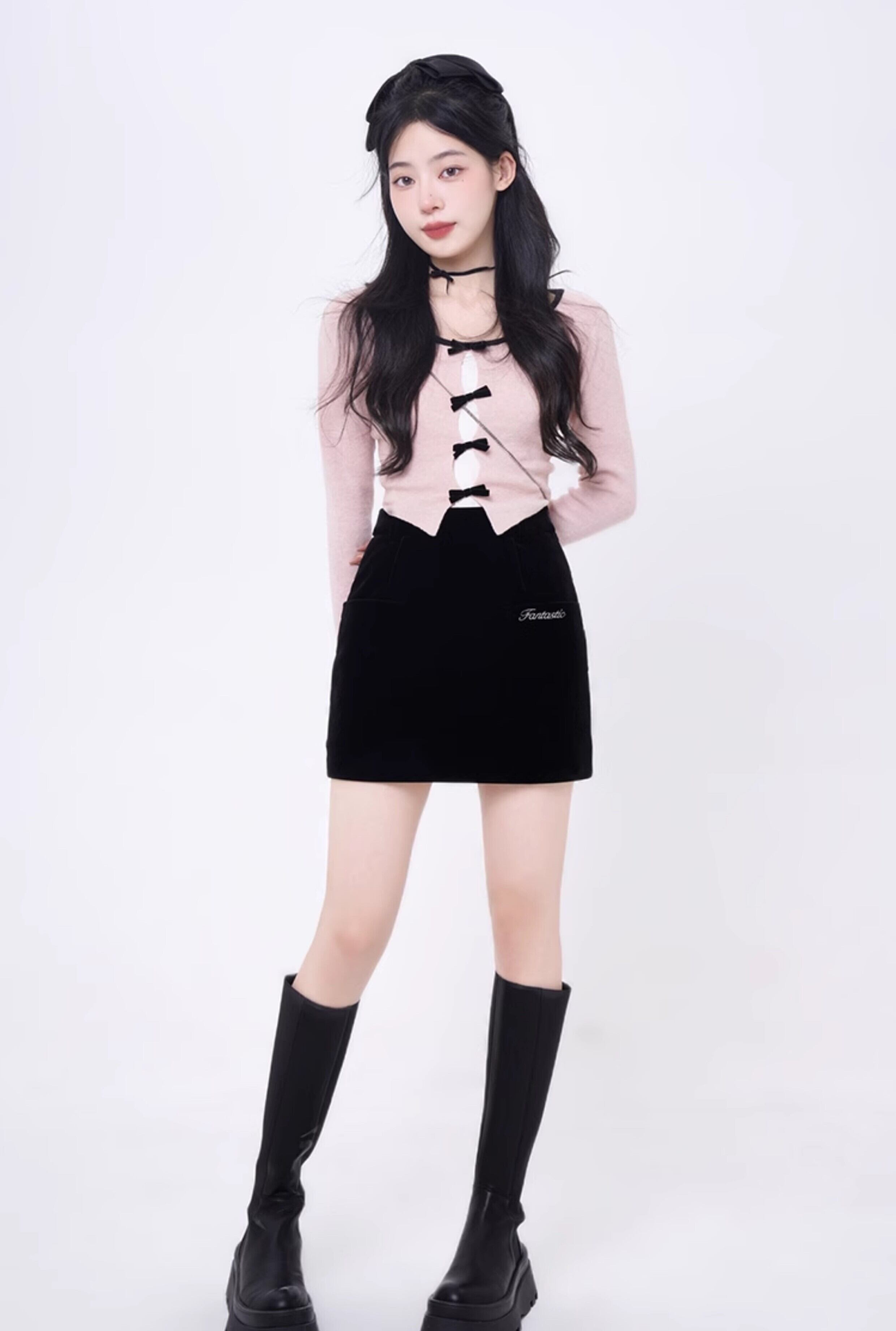 フロントのオープンデザインとリボン装飾が可愛らしいニットトップスと白無地キャミソールのトップス2点セットです。すっきり決まる細身シルエットのクロップド丈で、合わせるボトムスの丈を選ばずスタイルアップ効果抜群。鎖骨が見えるやや広めのネックラインが女らしく、キュートな印象です。ニットのインナーをバンドゥブラ等にすれば肌見せ多めのセクシーな着こなしに。それぞれ単品でも着回しがきく、フェミニン度高めのアイテムです。