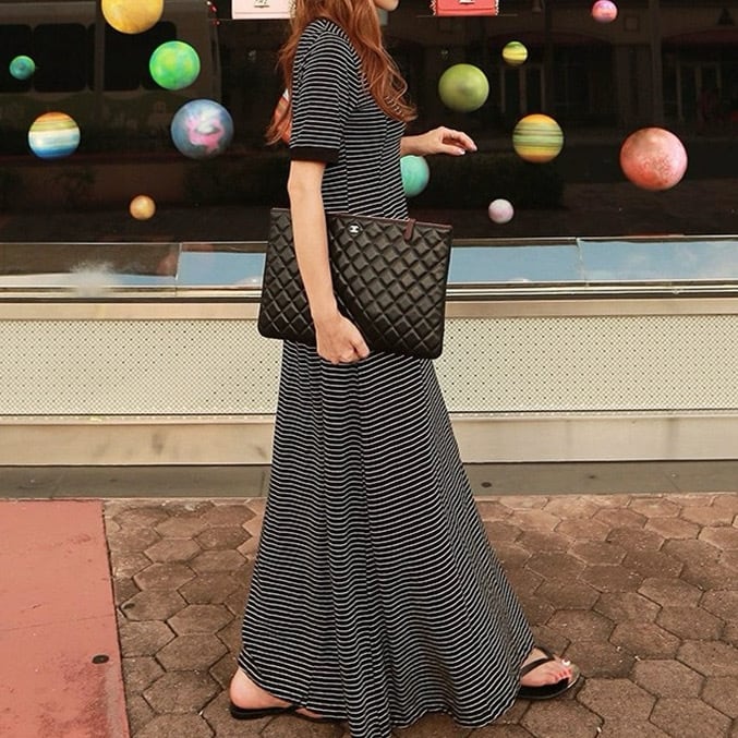 ブラックとホワイトのストライプ柄がおしゃれなマキシTシャツワンピース。