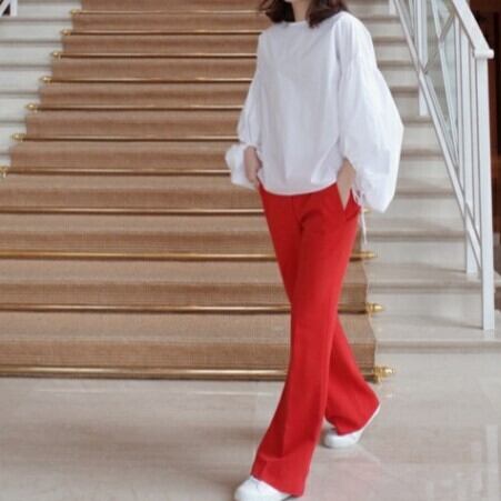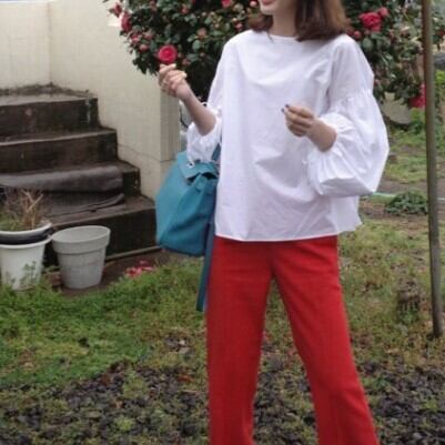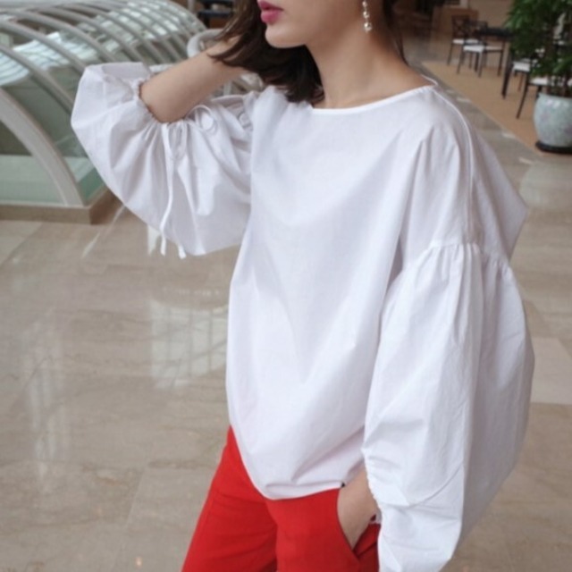 ボートネックとボリュームたっぷりのバルーン袖が女性らしさを引き立て、シンプルなデザインでどんなコーディネートにも合わせやすいのが魅力です。