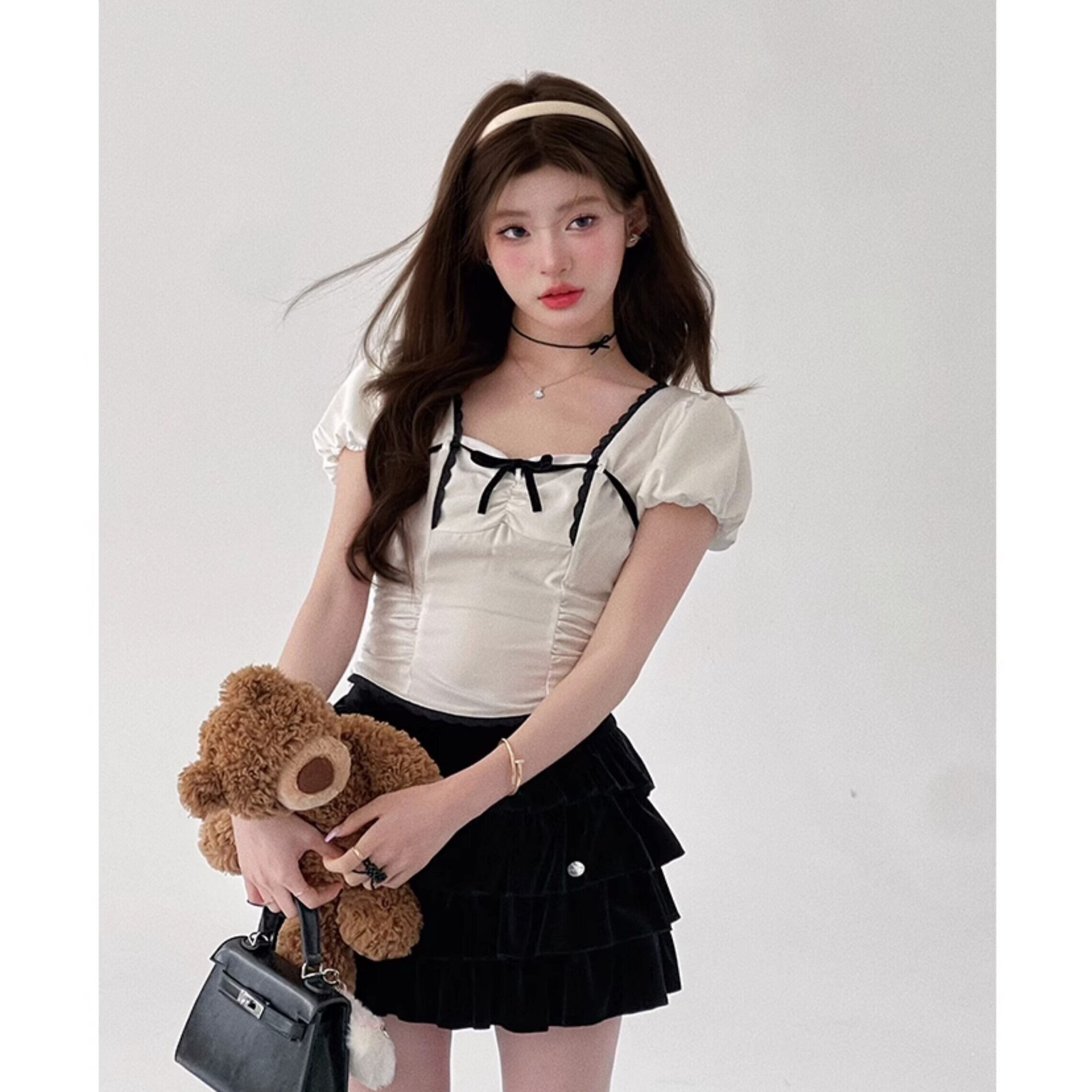 胸元リボン クロップドブラウス レディース トップス ブラウス スリム 細身 ショート 半袖 ボリューム袖 パフスリーブ スクエアネック 襟なし 鎖骨見せ デコルテ見せ ギャザー 配色 スカラップレース かわいい 大人可愛い きれいめ シンプル カジュアル 上品 おしゃれ ガーリー 抜け感 ラブリー キュート フェミニン 無地 格子柄 ギンガムチェック 春 夏 女の子 デート お出かけ 休日 合コン コンパ カフェ 脚長 普段使い モテ XS S M L 小さいサイズ ホワイト ブラック モノトーン
