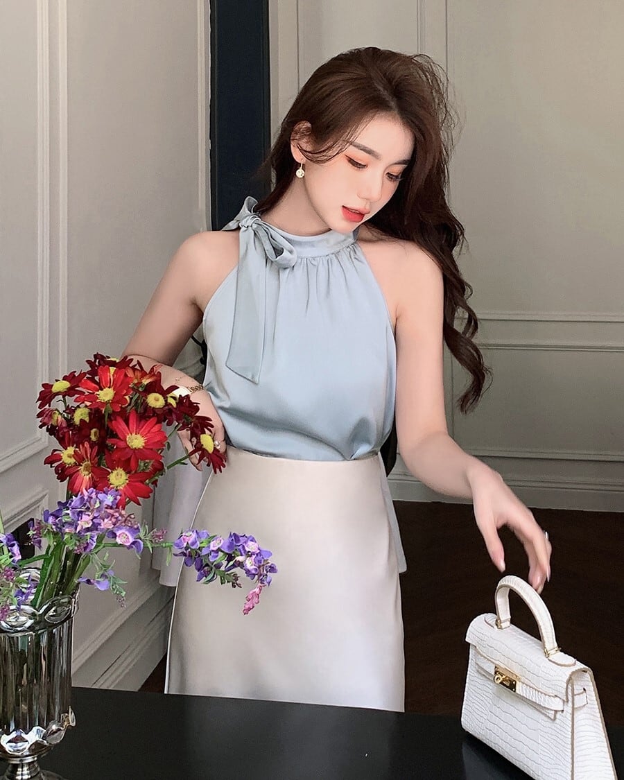 ネックリボン レディース トップス ブラウス ゆったり ストレート ミディアム 袖なし ノースリーブ アメリカンスリーブ 肩出し ホルターネック 襟付き 首元ギャザー かわいい 大人可愛い きれいめ シンプル 上品 おしゃれ こなれ感 クール エレガント 抜け感 都会的 フェミニン 涼しげ 爽やか 無地 春 夏 ママ 女の子 OL 通勤 デート お出かけ イベント レストラン 女子会 休日 ホテル カフェ 重ね着 韓国 オルチャン 体型カバー 普段使い 着回し モテ ジャケットイン S M L ブルー