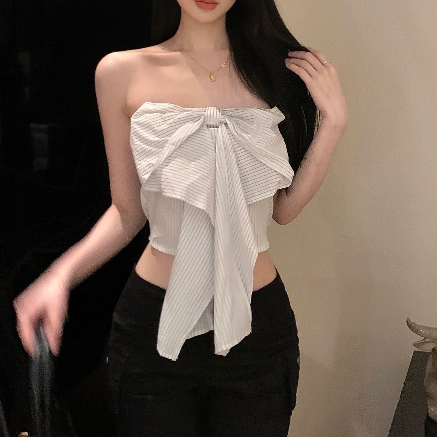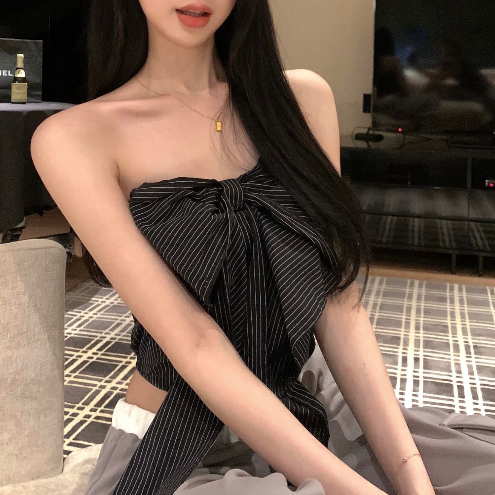 キュートでラブリーなデザインのチューブトップ。夏らしいストライプ柄と女性らしいリボンが可愛らしさを引き立てます。ショート丈でスリムなシルエットなので、細身効果も抜群!上品さも演出できるので、デートや女子会などのお出かけシーンでも大活躍間違いなしのアイテムです。
