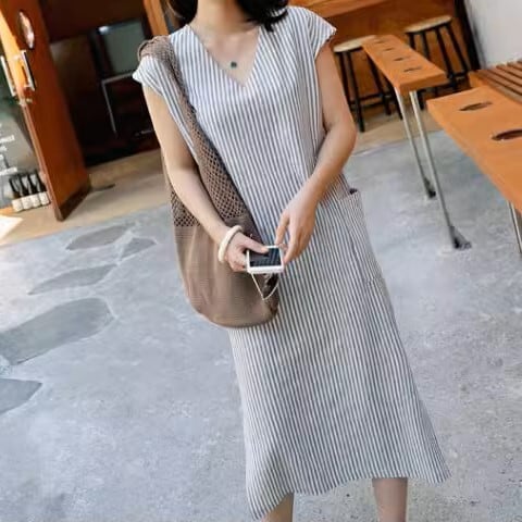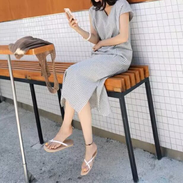 レディース スカート ワンピース プルオーバー オールインワン ミモレ ミディアム ミドル 半袖 Vネック ストレート Iライン サイドスリット ポケット コンサバ 綿 コットン きれいめ シンプル カジュアル 上品 おしゃれ かっこいい こなれ感 ラフ ルーズ 抜け感 ナチュラル ストライプ 春 夏 母の日 ママ デート お出かけ 旅行 公園 女子会 休日 ガーデン ショッピング カフェ 韓国 コーデ スタイル 楽ちん 体型カバー 普段使い サイズ S M L XL ゆったり ゆる グレー 大人カラー