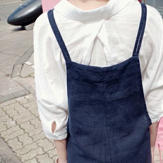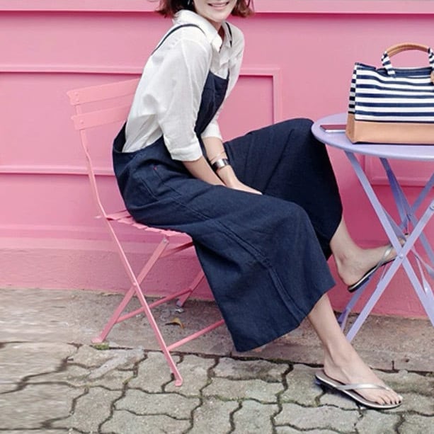 ラフでこなれたカジュアルスタイルを演出する、ネイビーブルーのワイドパンツサロペット。
