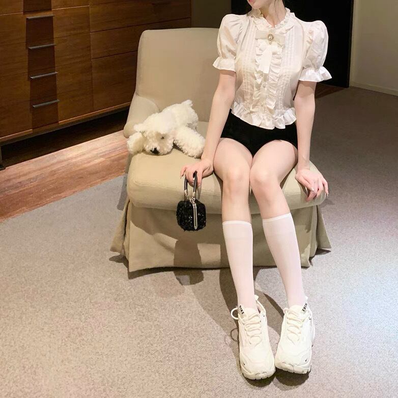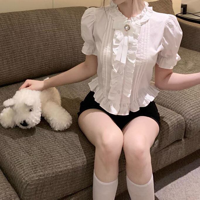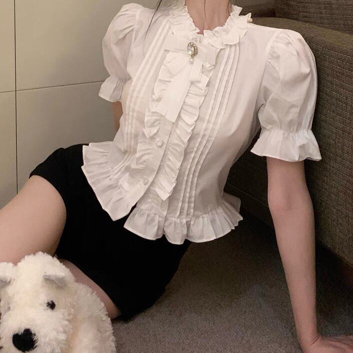 レディース トップス シャツ ブラウス 前開き ショート 半袖 パフスリーブ フリル袖 バルーン袖 ハイネック りぼんタイ スリム スリムフィット 細身 フェミニン プリーツ フリル リボン ボタン ビジュー かわいい おしゃれ レトロ ガーリー 主役級 存在感 ラブリー プリンセス クラシカル ロマンティック お嬢様 フレンチ 甘め シュガー ドーリー 無地 春 夏 デート お出かけ イベント ショッピング コンサート ライブ コスプレ 韓国 コーデ スタイル 普段使い サイズ S M L 白 ホワイト