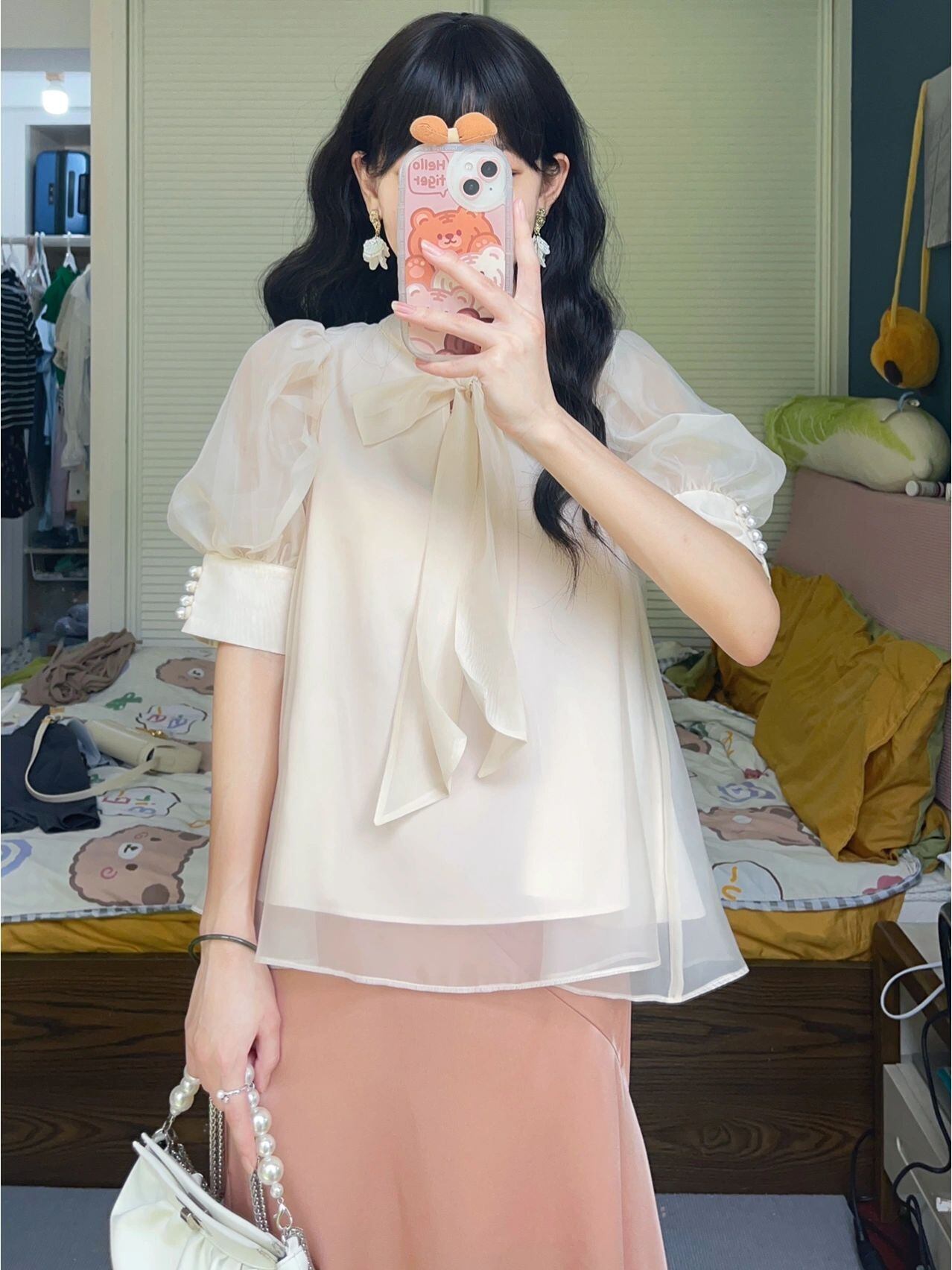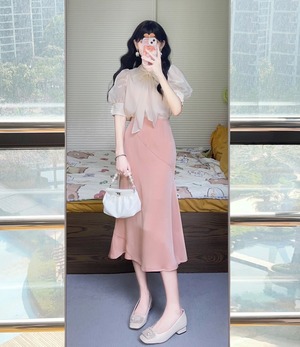 セットアップ 上下セット シアーブラウス 切替えスカート トップス ブラウス レディース スカート ボトムス 膝下 ミモレ ミディアム 5分袖 ボリューム袖 パフスリーブ Vネック りぼんタイ ボウカラー Aライン マーメイド 透け感 切り替えデザイン パール調ボタン かわいい 大人可愛い きれいめ シンプル 上品 おしゃれ こなれ感 エレガント フェミニン 無地 春 夏 女の子 オフィス OL 通勤 学生 学校 通学 デート お出かけ レストラン 休日 ホテル 脚長 着回し S M L ベージュ ピンク