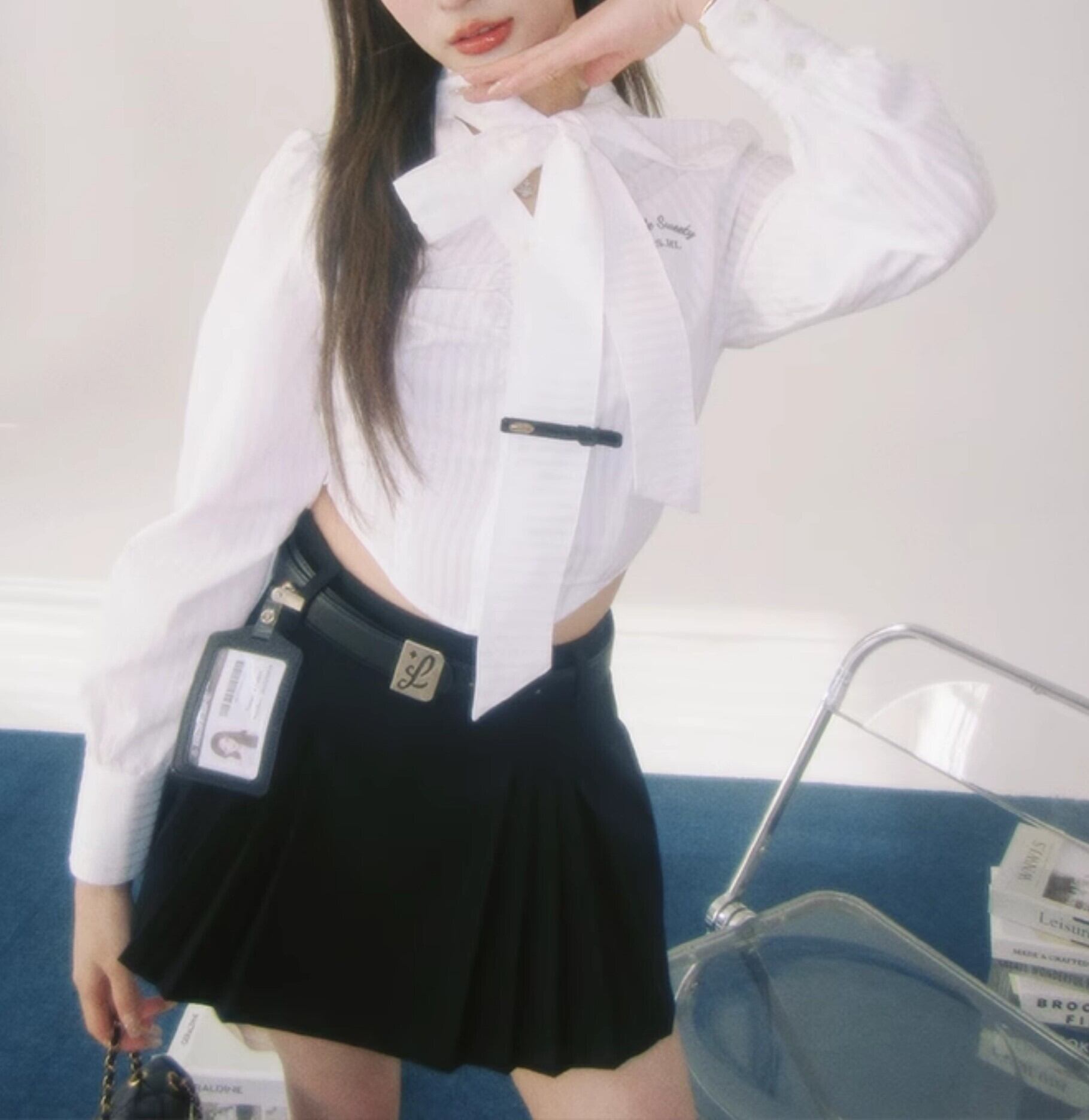 クロップドブラウス レディース トップス ブラウス すっきり ウエストシェイプ ショート 長袖 Vネック りぼんタイ ボウカラー 刺繍 胸刺しゅう かわいい 大人可愛い きれいめ シンプル カジュアル 上品 おしゃれ こなれ感 ガーリー 存在感 キュート 学生風 フェミニン ストライプ 春 夏 秋 女の子 学生 学校 通学 デート お出かけ 女子会 休日 ショッピング ライブ 重ね着 韓国 オルチャン コーデ 脚長 普段使い 着回し モテ XS S M L 小さいサイズ 白 ホワイト 水色 ブルー