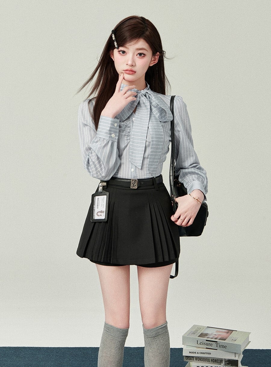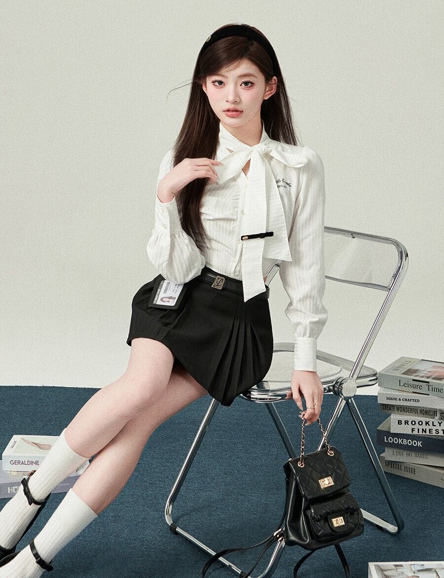 首元の大きめリボンタイがポイントの上品で可愛らしいクロップドブラウスです。ウエストをシェイプした短め丈で、スタイルアップ効果抜群。シンプルでいて爽やかに決まるストライプ柄で、胸の刺繍もさりげなくおしゃれ。合わせるボトムス次第でウエスト周りの肌見せが際立ち、ちょっぴりセクシーな着こなしも可能です。カーディガンやジャケットを羽織るレイヤードアイテムとしても活躍します。