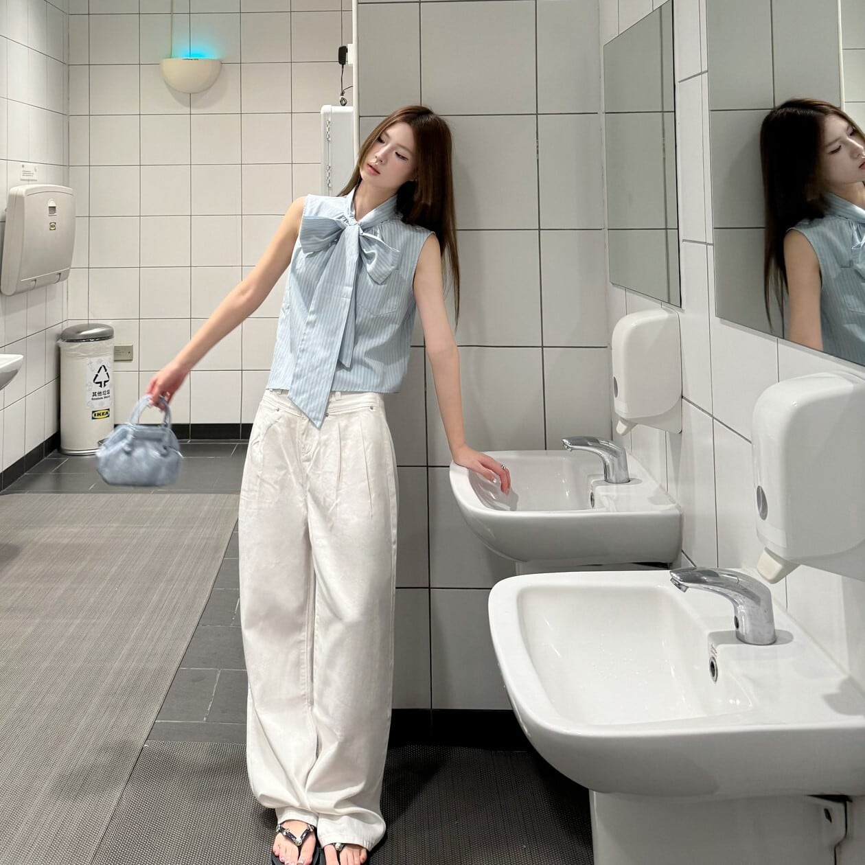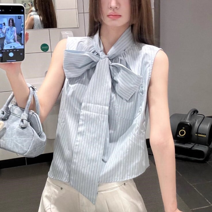 アシンメトリーヘム レディース トップス ブラウス ゆったり ミディアム丈 袖なし ノースリーブ 襟付き スタンドカラー りぼんタイ ボウカラー かわいい 大人可愛い きれいめ シンプル カジュアル 上品 おしゃれ こなれ感 エレガント 都会的 フェミニン 爽やか 涼しげ ストライプ 夏 女の子 OL 通勤 学生 学校 通学 デート お出かけ レストラン 休日 ホテル 合コン コンパ カフェ 重ね着 韓国 オルチャン コーデ 体型カバー 普段使い 着回し レイヤード ジャケットイン S M 水色 ブルー