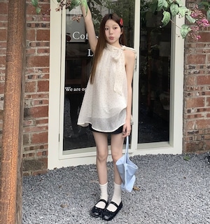 リラックス感漂う首元リボンブラウス。ゆったりとしたオーバーサイズのAラインで、体型をカバーしながらも女性らしいシルエットを演出します。裾に透け感のあるデザインと腕を出せるノースリーブデザインが涼しげで、小さめのドット柄が大人可愛い印象を与えるアイテムです。リゾートユースやデート、夏のお出かけや女子会など様々なシーンにマッチし、フェミニンで抜け感のあるスタイリングを叶えてくれます。