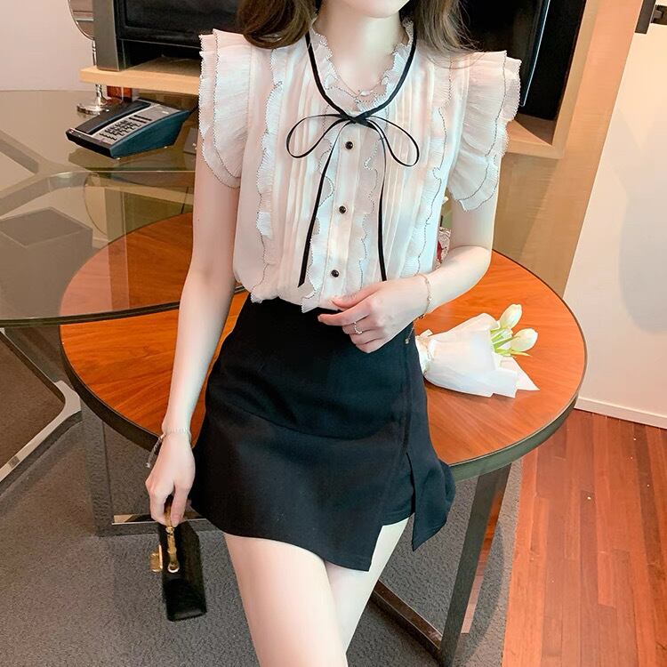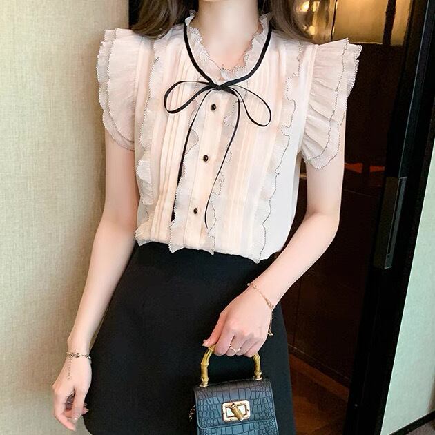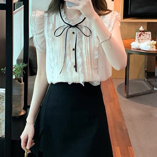 レディース トップス ブラウス 前開き 袖なし ノースリーブ フリル袖 スタンドカラー りぼんタイ スリム 細身 フェミニン プリーツ シフォン フリル リボン 透け感 薄手 かわいい 大人可愛い きれいめ 上品 おしゃれ ガーリー エレガント ヴィンテージ ラブリー プリンセス クラシカル ロマンティック ドーリー フェアリー 無地 春 夏 学生 デート お出かけ 公園 女子会 休日 ガーデン ショッピング カフェ 韓国 オルチャン コーデ 着回し レイヤード モテ S M L XL 色 アプリコット
