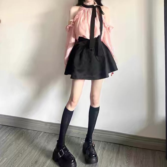 レディース トップス シャツ ブラウス 長袖 オープンショルダー プリーツパフ ホルターネック スタンドカラー ボウタイ りぼんタイ フェミニン 肩出し タック フリル リボン コントラストカラー 薄手 かわいい 大人可愛い カジュアル 上品 おしゃれ ガーリー 個性的 主役級 存在感 ラブリー クラシカル ロマンティック セクシー ドーリー フェアリー 無地 春 秋 学生 デート お出かけ 公園 女子会 ホテル ショッピング ライブ 韓国 オルチャン コーデ 普段使い 着回し S M L XL ピンク