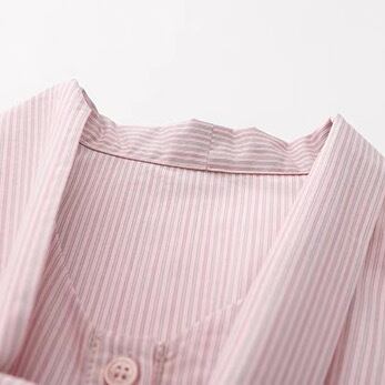 春夏にぴったりのピンクストライプのパフスリーブボウタイシャツ。