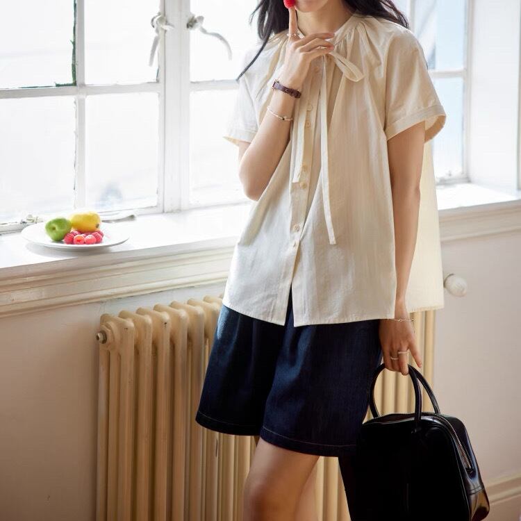 丸みを帯びた首元に付いたりぼんタイが女性らしさを際立たせます。