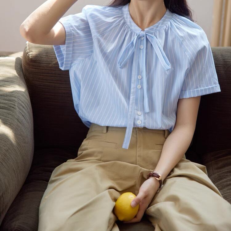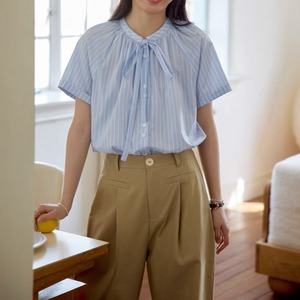 レディース トップス シャツ ブラウス 前開き 半袖 りぼんタイ フェミニン タックプリーツ リボン コンサバ かわいい 大人可愛い きれいめ シンプル カジュアル おしゃれ ラフ ガーリー 抜け感 ヴィンテージ キュート クラシカル カレッジ風 学生風 ロマンティック ナチュラル ストライプ 春 夏 入学式 入園式 卒業式 卒園式 授業参観 ママ OL 学生 デート お出かけ 公園 女子会 休日 ショッピング 韓国 オルチャン コーデ スタイル 普段使い 着回し サイズ S M L イエロー ブルー