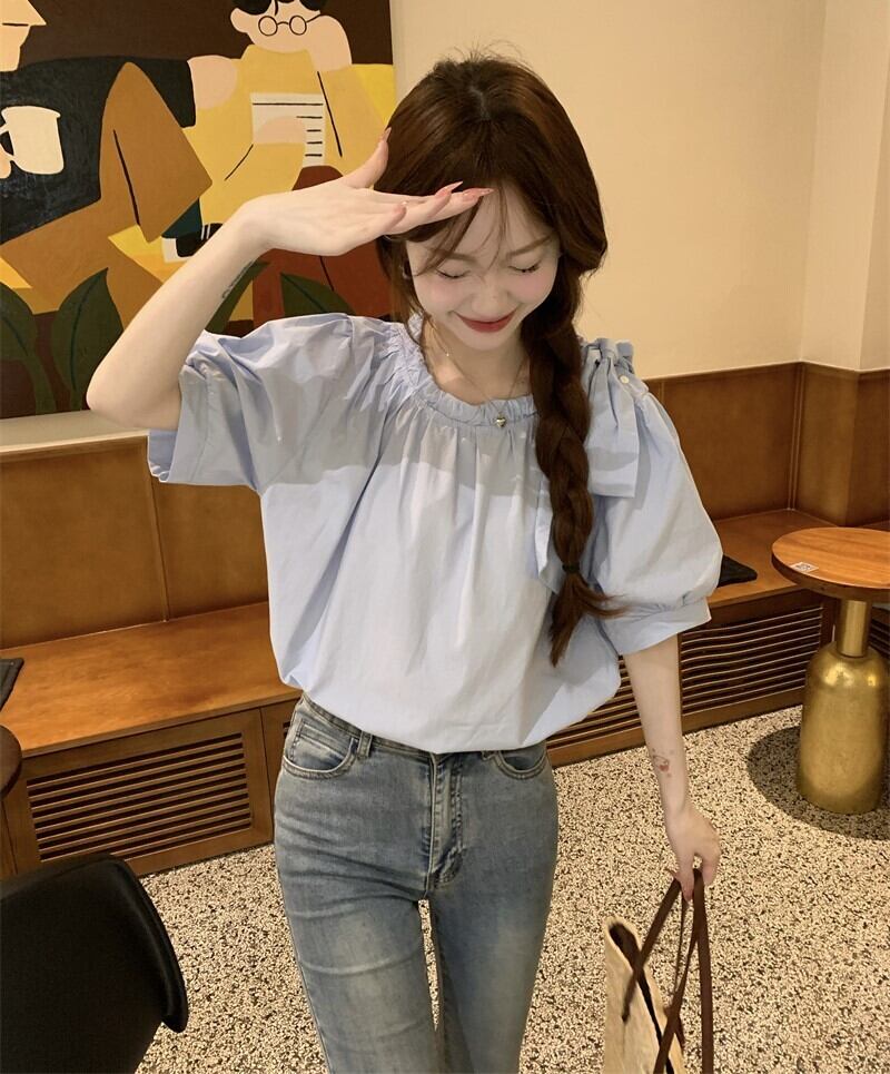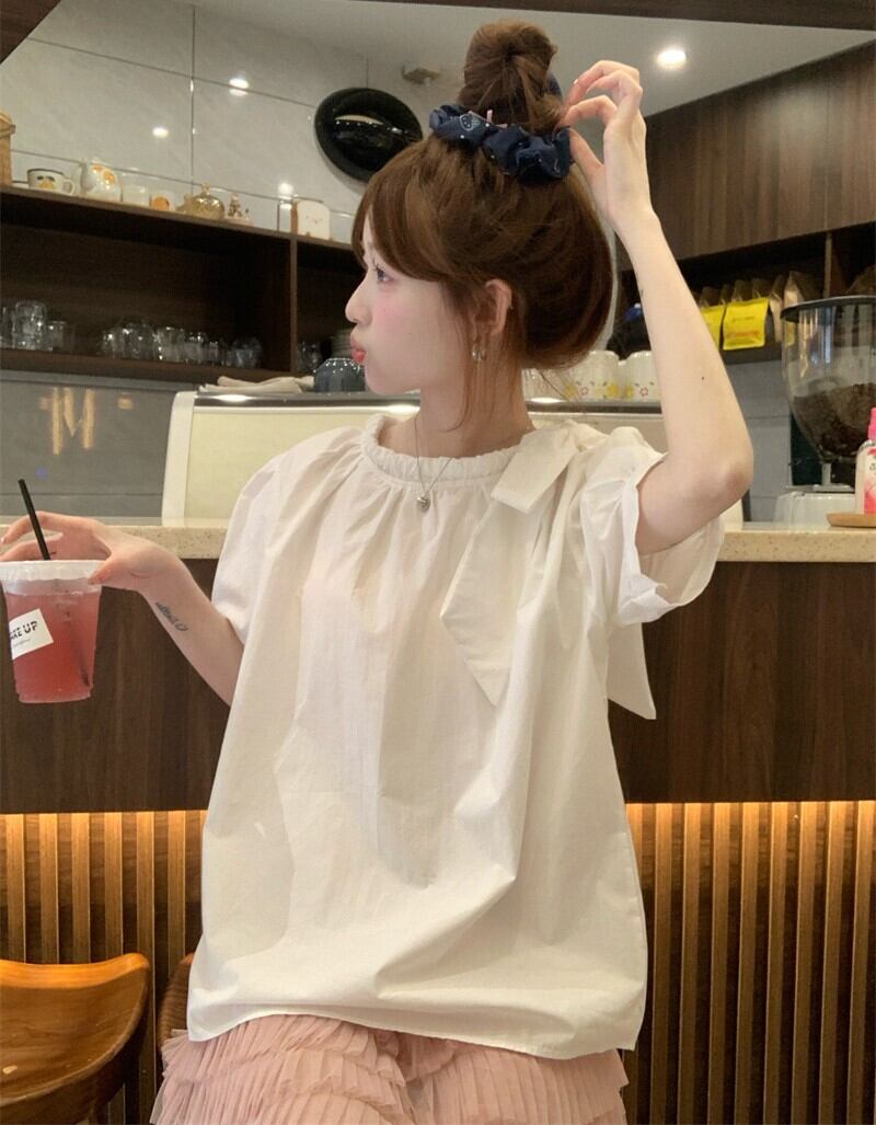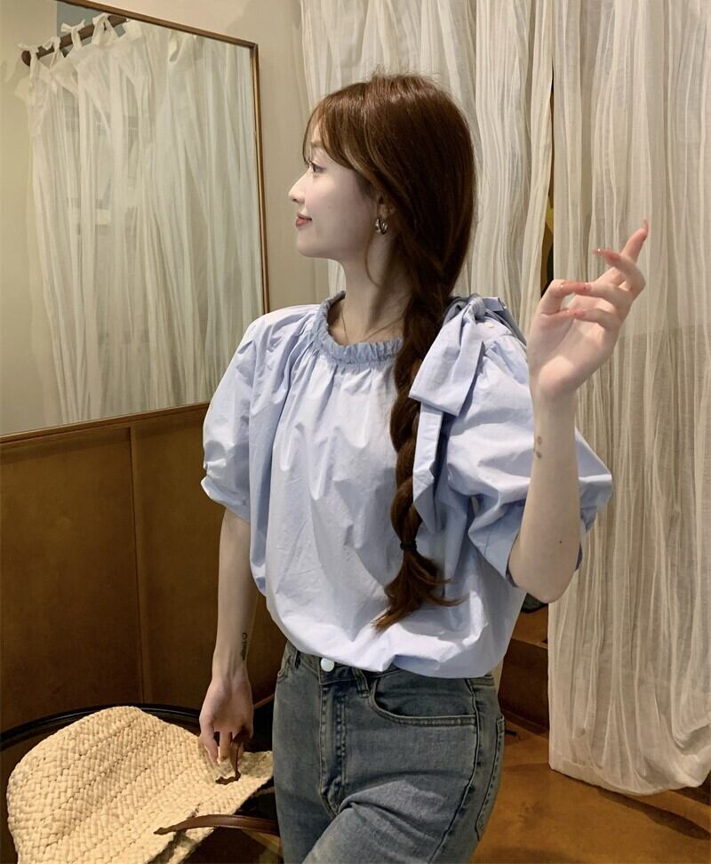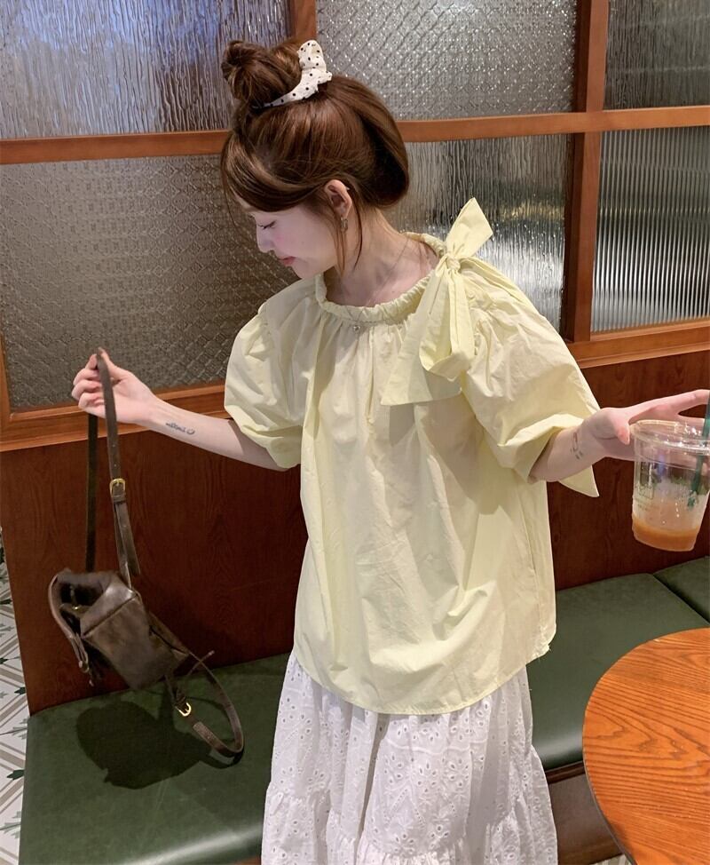 ネックドロスト リボン レディース トップス ブラウス ゆったり オーバーサイズ ミディアム 5分袖 ボリューム袖 パフスリーブ クルーネック かわいい 大人可愛い きれいめ シンプル カジュアル 上品 おしゃれ こなれ感 ガーリー キュート ナチュラル フェミニン 無地 春 夏 ママ 女の子 学生 学校 通学 デート お出かけ 公園 女子会 休日 ショッピング 合コン コンパ カフェ 韓国 オルチャン コーデ 体型カバー 普段使い 着回し 清楚 フリーサイズ 白 ホワイト 黄色 イエロー 青 ブルー
